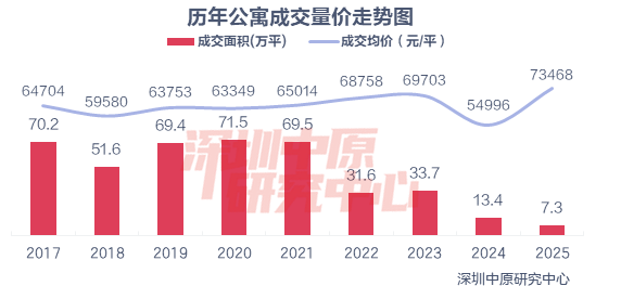 2025年全市公寓成交面积7.3万㎡,为近十年最低,同比下滑45.3%;公寓成交均价为73468元/㎡,较2024年上升33.6%。