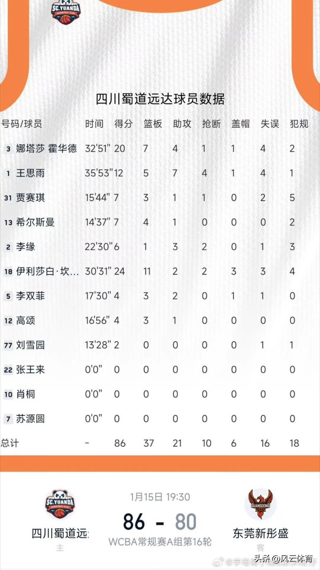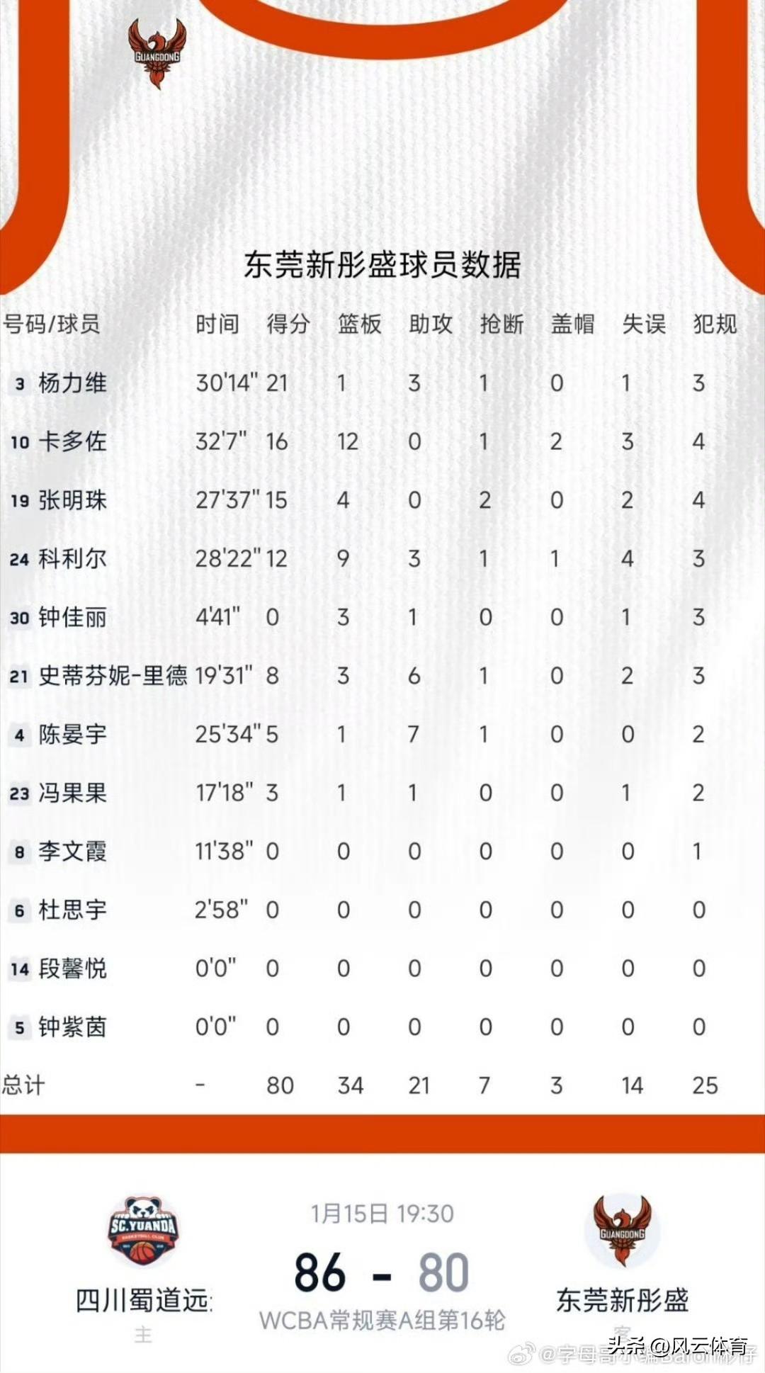 双拳难敌四手!广东女篮客场不敌四川! 北京时间1月15日,四川远达美乐女篮坐镇主场迎战联赛领头羊广东女篮的挑战。此役,四川女篮外援坎贝奇和霍华德联手砍下44分18篮板,从而带领四川女篮战胜广东女篮,捍卫了主场荣誉!广东女篮这边,杨力维凭借一己之力砍下21分,但最终双拳难敌四手! 随着今晚的比赛结束,WCBA第16轮比赛全部落下帷幕,广东女篮以14胜2负继续排名第一,山西女篮12胜4负紧随其后,山东、江苏和四川分列3到5名。