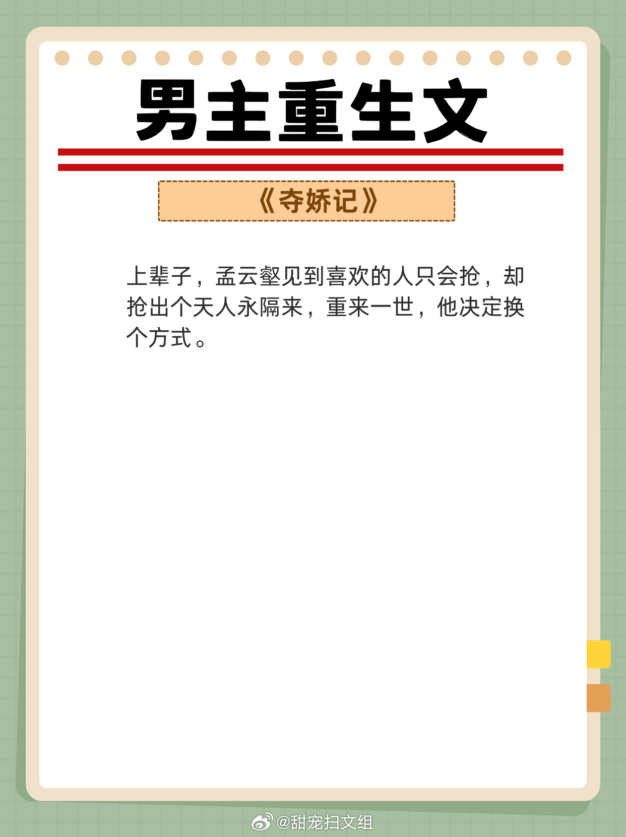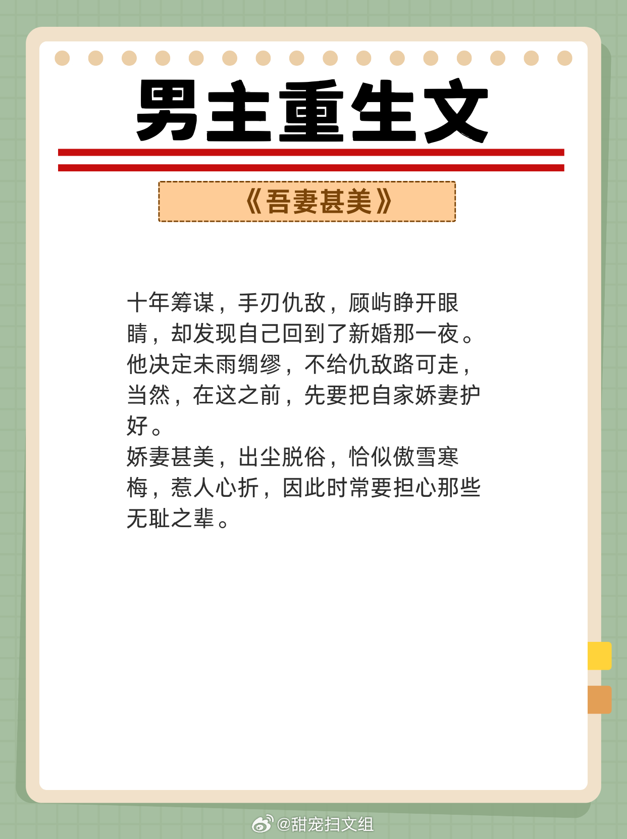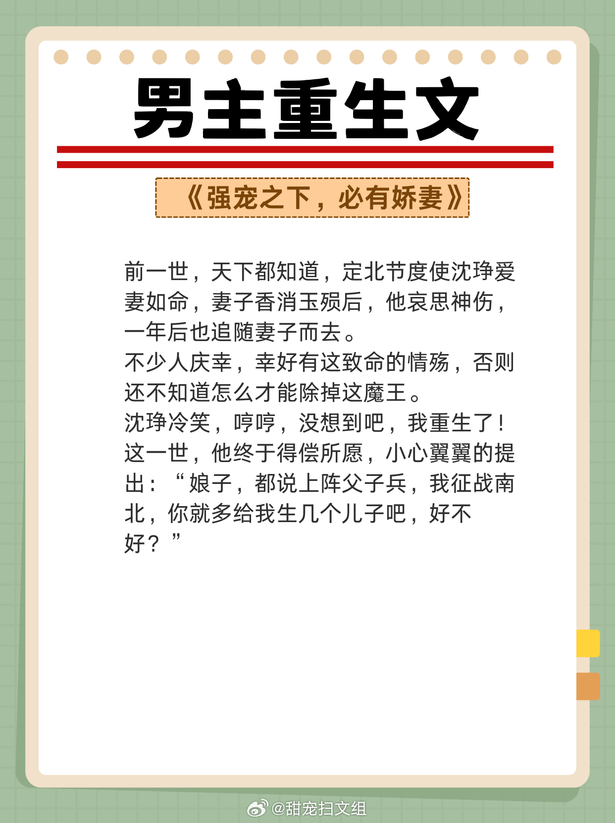 男主重生文,重活一世,强势宠妻,弥补遗憾!两世姻缘,前世怨侣,今生美满!!1、《从萤》 作者:木秋池2、《春江花月》 作者:蓬莱客3、《吾妻甚美》 作者:若然晴空4、《公侯之家》 作者:绣锦5、《悍妃在上》 作者:假面的盛宴6、《奈何她媚色撩人》 作者:发达的泪腺7、《夺娇记》 作者:美人乔8、《宠妾养成记》 作者:抹茶曲奇9、《强宠之下,必有娇妻》 作者:素衣渡江网文界的诸神之战 越读越上头的小说神作