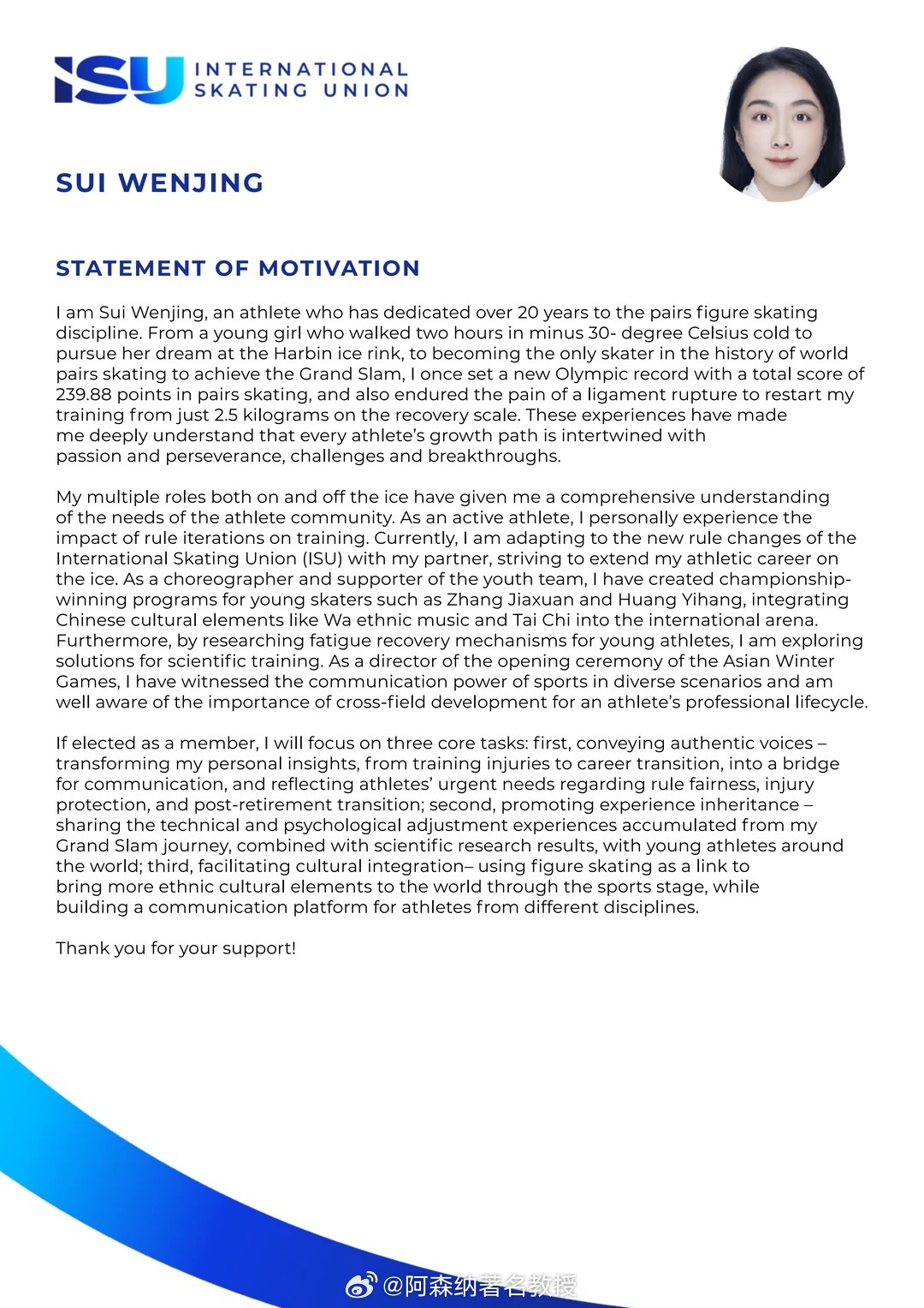 隋文静武大靖竞选ISU运动员委员会委员 隋文静、武大靖参选ISU运动员委员会委员,选举结果将于2026年3月21日公布,期待有更多的中国声音