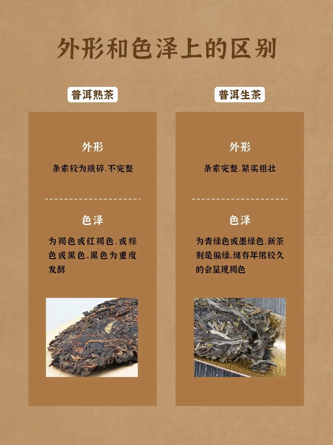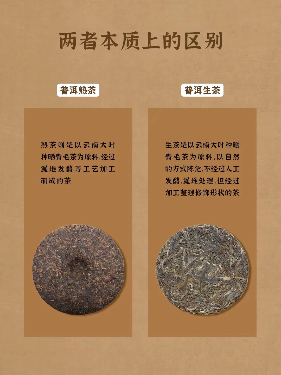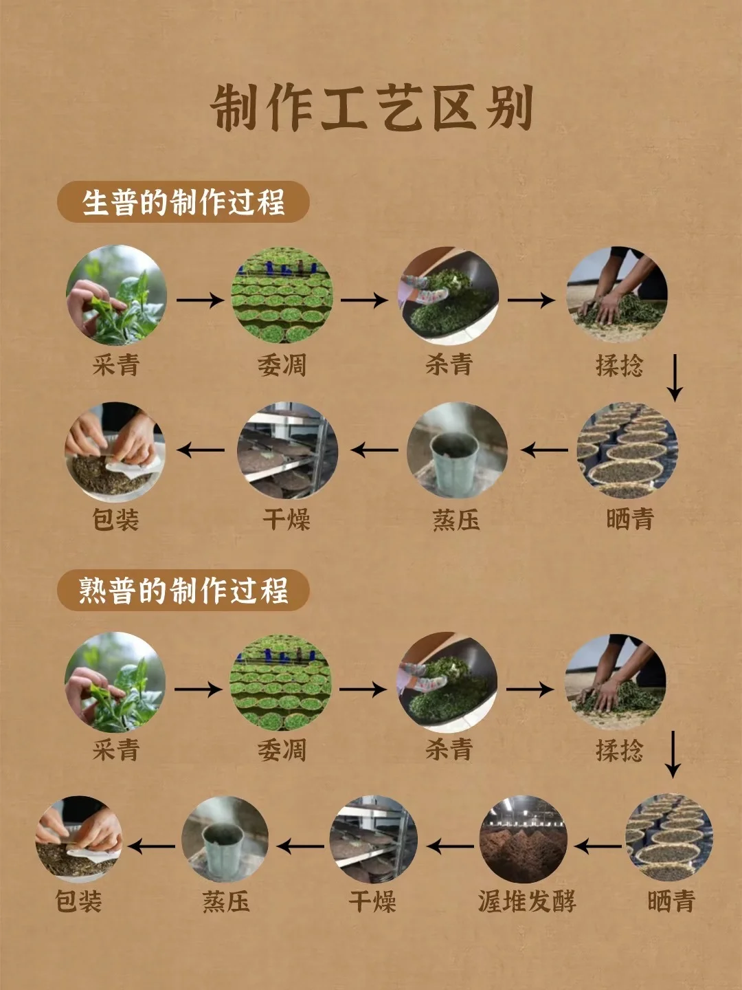 熟茶则是以云南大叶种晒青毛茶为原料,经过渥堆发酵等工艺加工而成的茶 生茶是以云南大叶种晒青毛茶为原料,以自然的方式陈化,不经过人工发酵、渥堆处理,但经过加工整理修饰形状的茶 熟普和生普的核心区别在于制作工艺、口感特点和外形与色泽上的区别