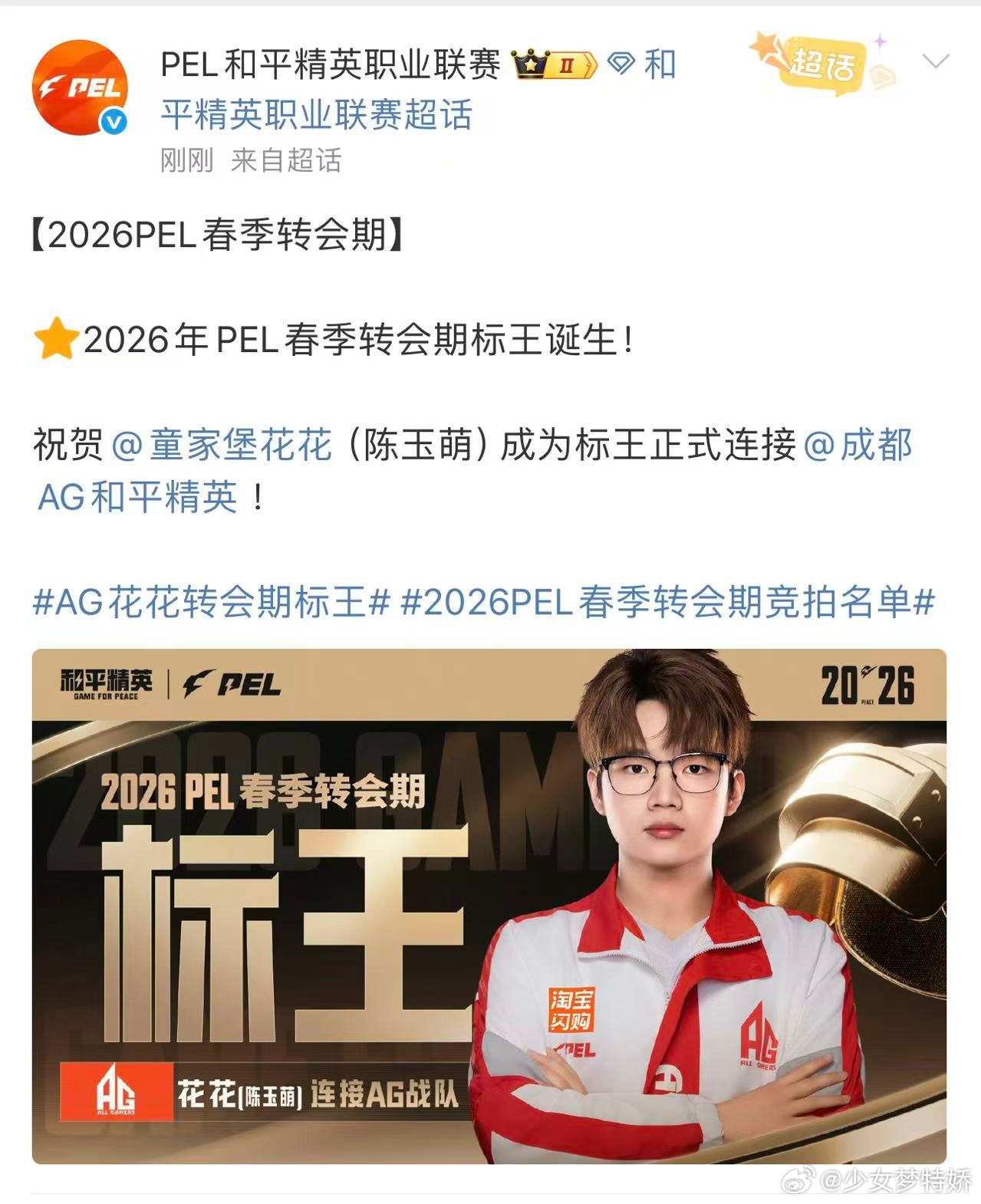 2026PEL春季转会期竞拍名单AG花花转会期标王 转会期圆满落幕!聚是一团火燃尽赛场,散是满天星奔赴新程,每一次换队都是为梦想再出发,花花实至名归拿下标王,亚运金牌+联赛冠军的荣誉加身,加盟AG续写传奇,期待新赛季枪指荣光,繁花满路!