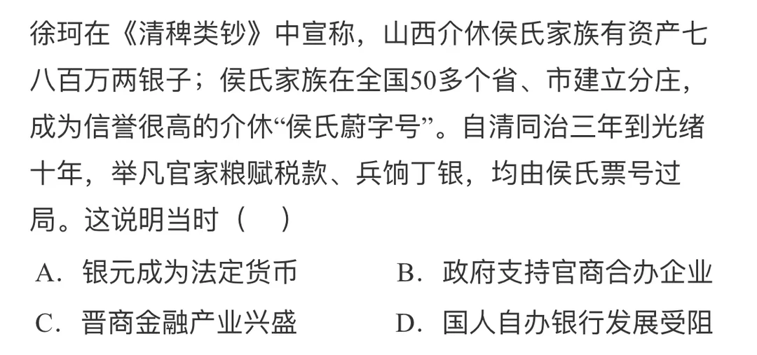 材料仅有康氏家族的相关信息,不涉及“各族”同源共祖观念,排除D项。故选C项。