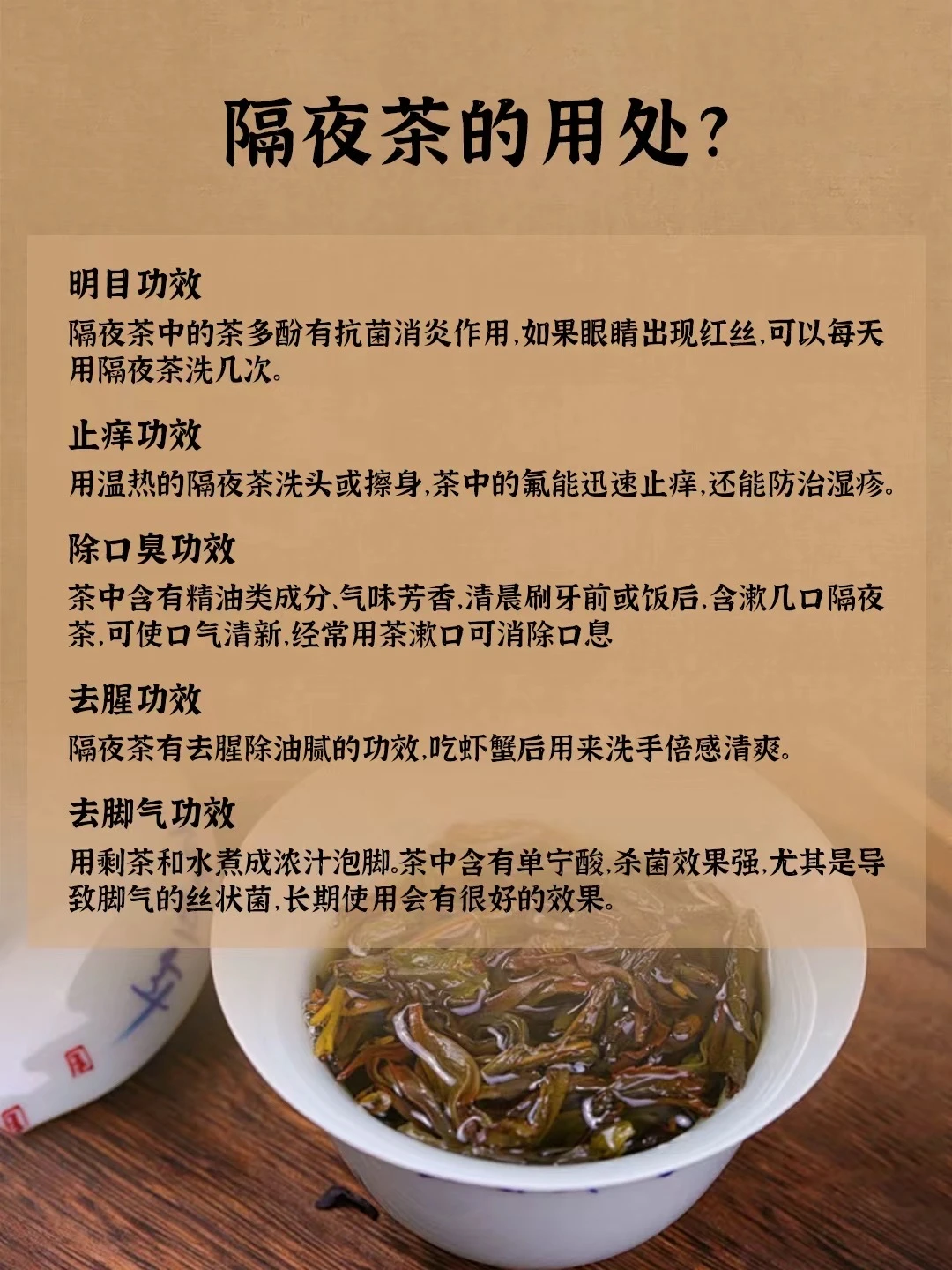 隔夜茶的用处: 明目功效 止痒功效 除口臭功效 去腥功效 去脚气功效