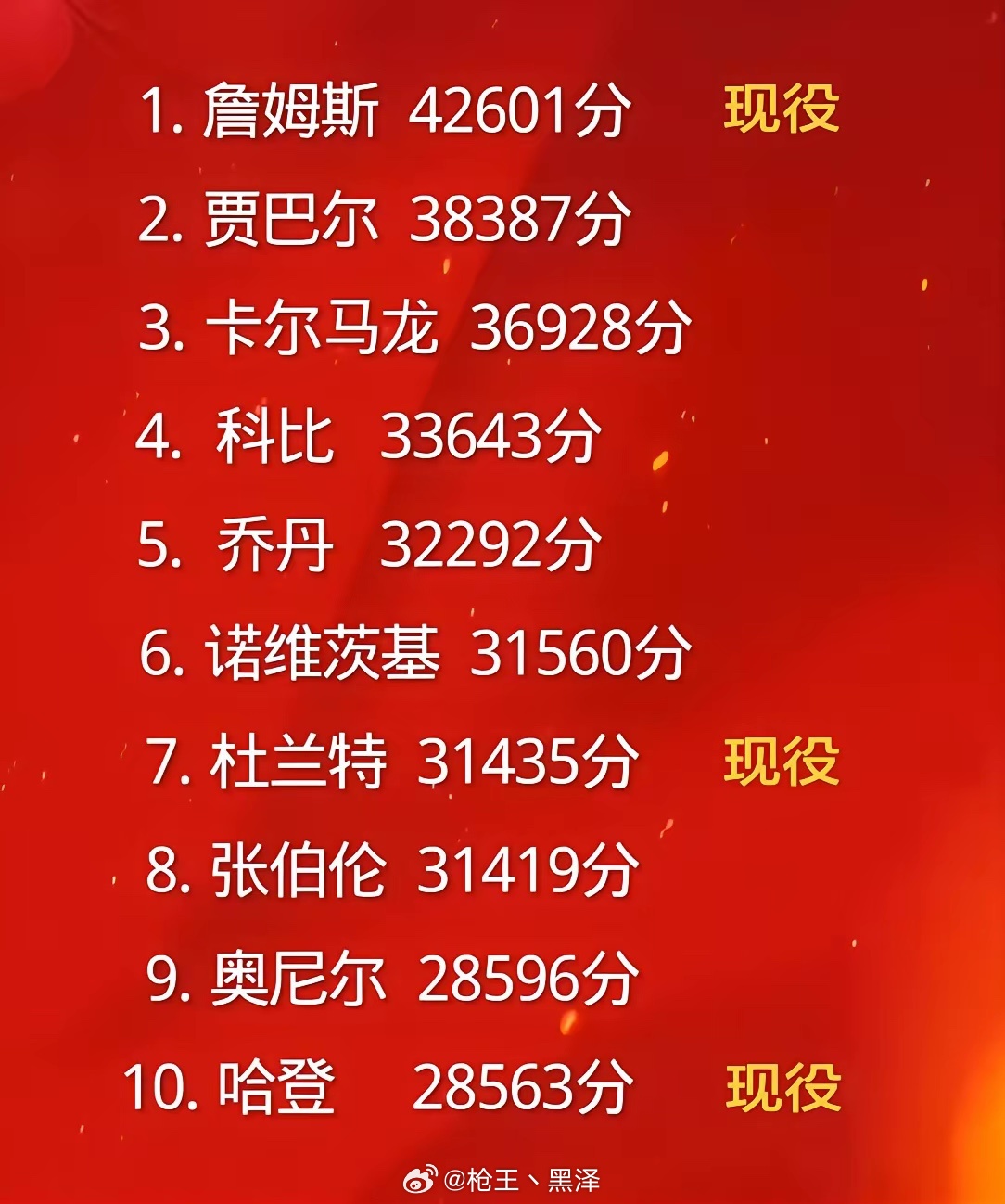 NBA历史得分前10名排行榜,从目前的情况来看,最有可能被挤出历史前10的就是奥尼尔了。将来,历史前10的巨星得分,都是30000+,现役球员最接近30000分的就是哈登,差1437分。另一个有可能进入30000+的,或许就是库里了吧?威斯布鲁克大概率是得不到30000分了。利拉德伤病,也希望不大了。还有谁呢?