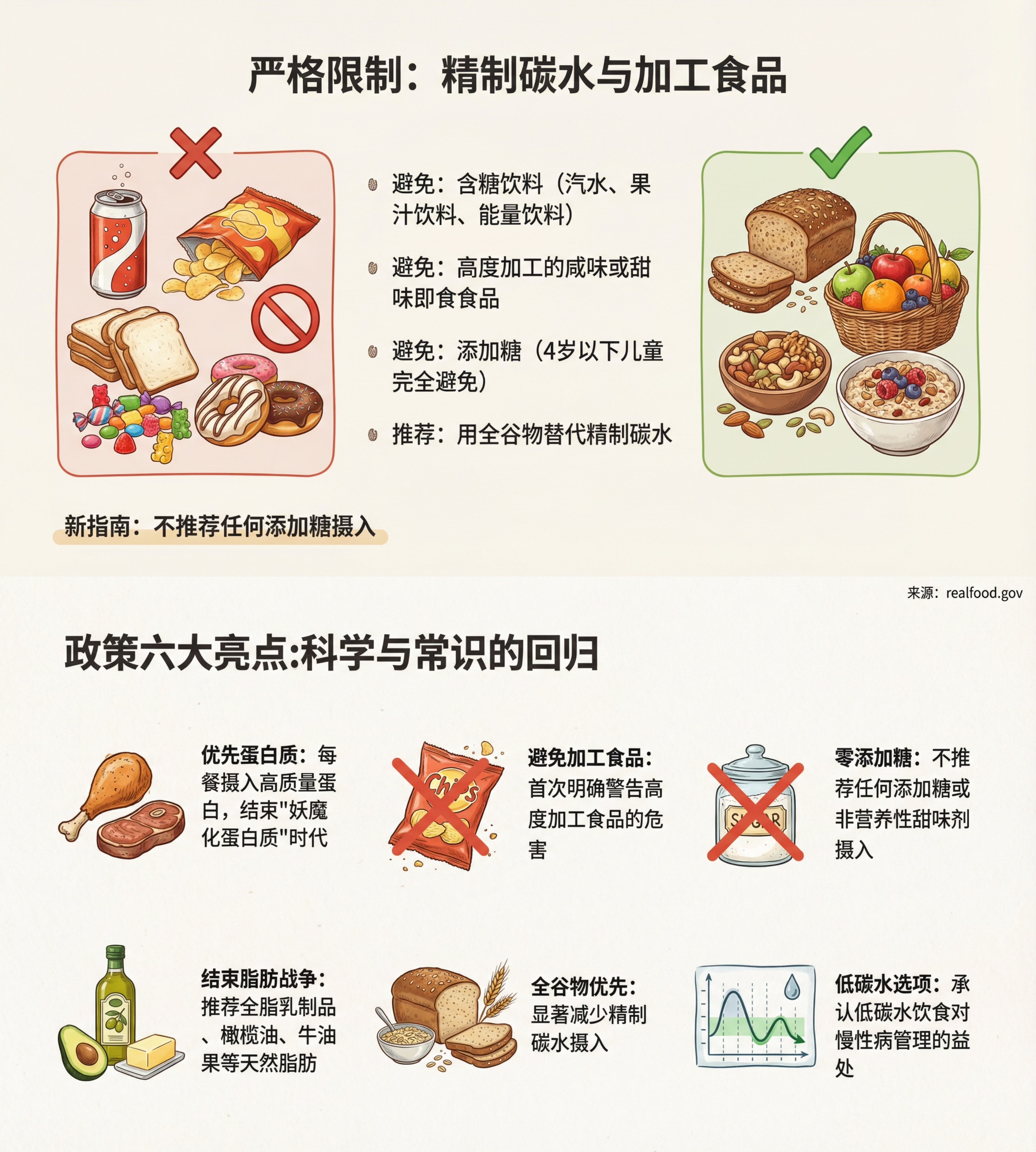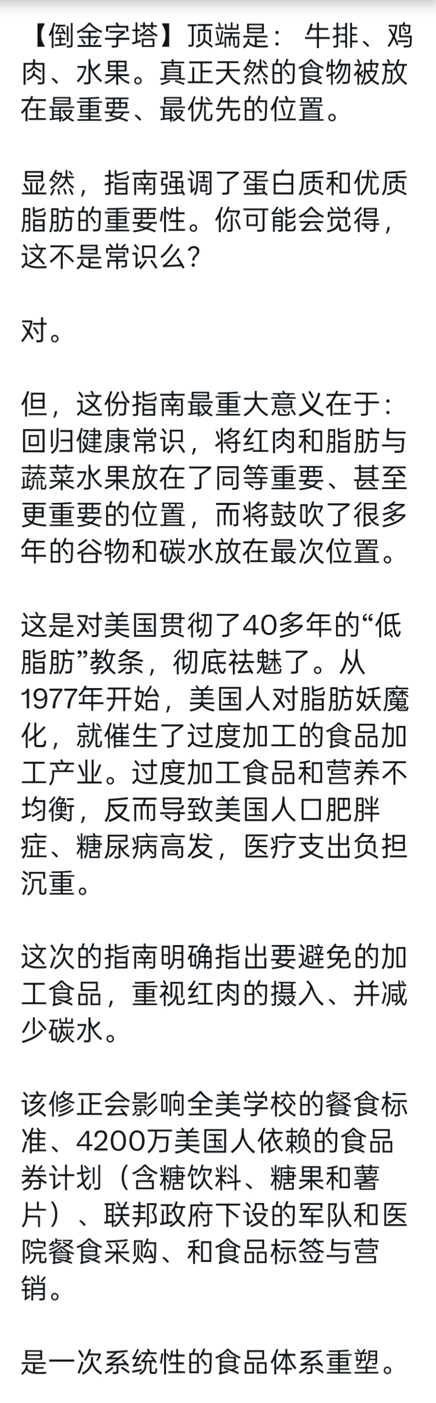 最近很多人讨论的新版美国膳食指南:1、“吃真正的食物”(Eat Real Food)作为贯穿全篇的最简洁、最强势主轴,首次把食物加工程度本身作为健康风险判断标准。 2、优先强调高品质蛋白质、健康脂肪、蔬菜、水果、全脂/无糖乳制品。3、首次明确点名“高度加工食品”的危害,建议避免咸甜包装零食、即食食品、含糖饮料等。4、首次把肠道健康/肠道微生物群纳入考虑,推荐富含纤维、发酵食品的饮食。5、引入倒置食物金字塔:顶层(最优先)是蛋白质+乳制品+健康脂肪+蔬果,底部才是全谷物(与过去几十年“谷物优先”完全相反)。(制图:NENE)