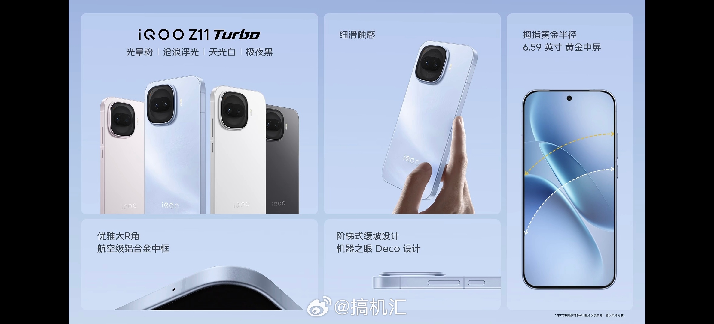 iQOO Z11 Turbo颜值手感双在线4色可选:沧浪浮光/光晕粉/天光白/极夜黑,旗舰航空铝中框+细腻后盖,大R角精致耐看IP68/IP69防尘防水+6.59英寸黄金中屏,74.42mm宽度手感,缓坡Deco,悬浮设计可以说是点睛之笔!
