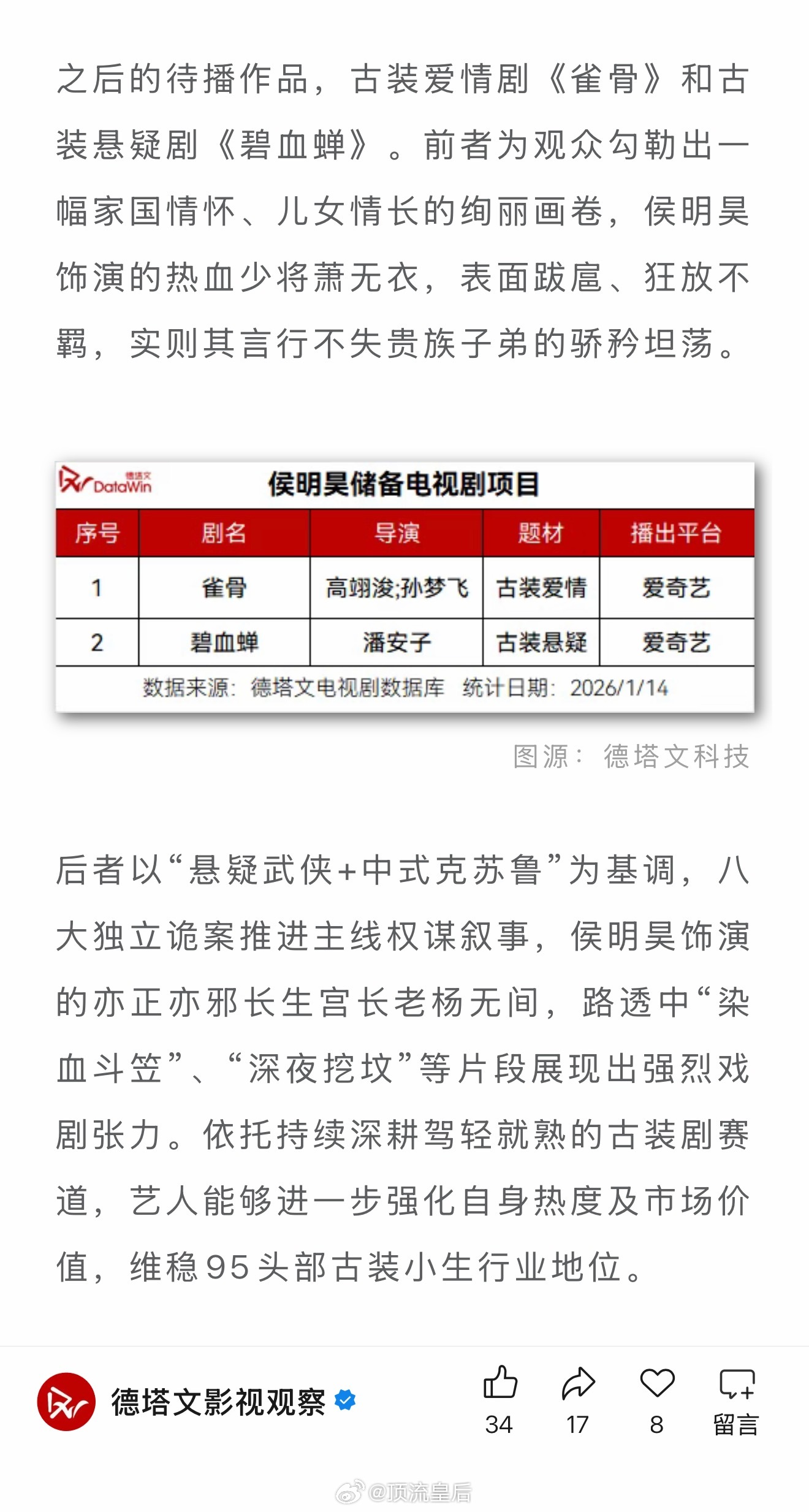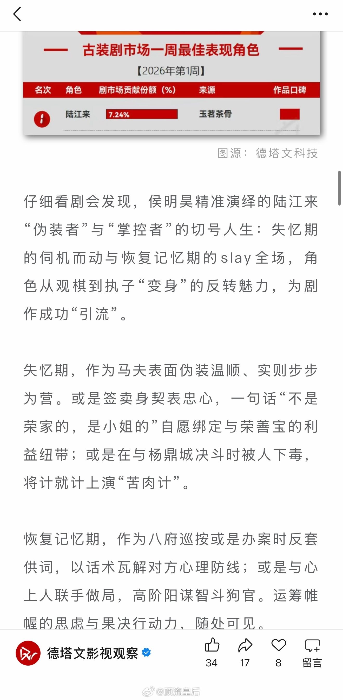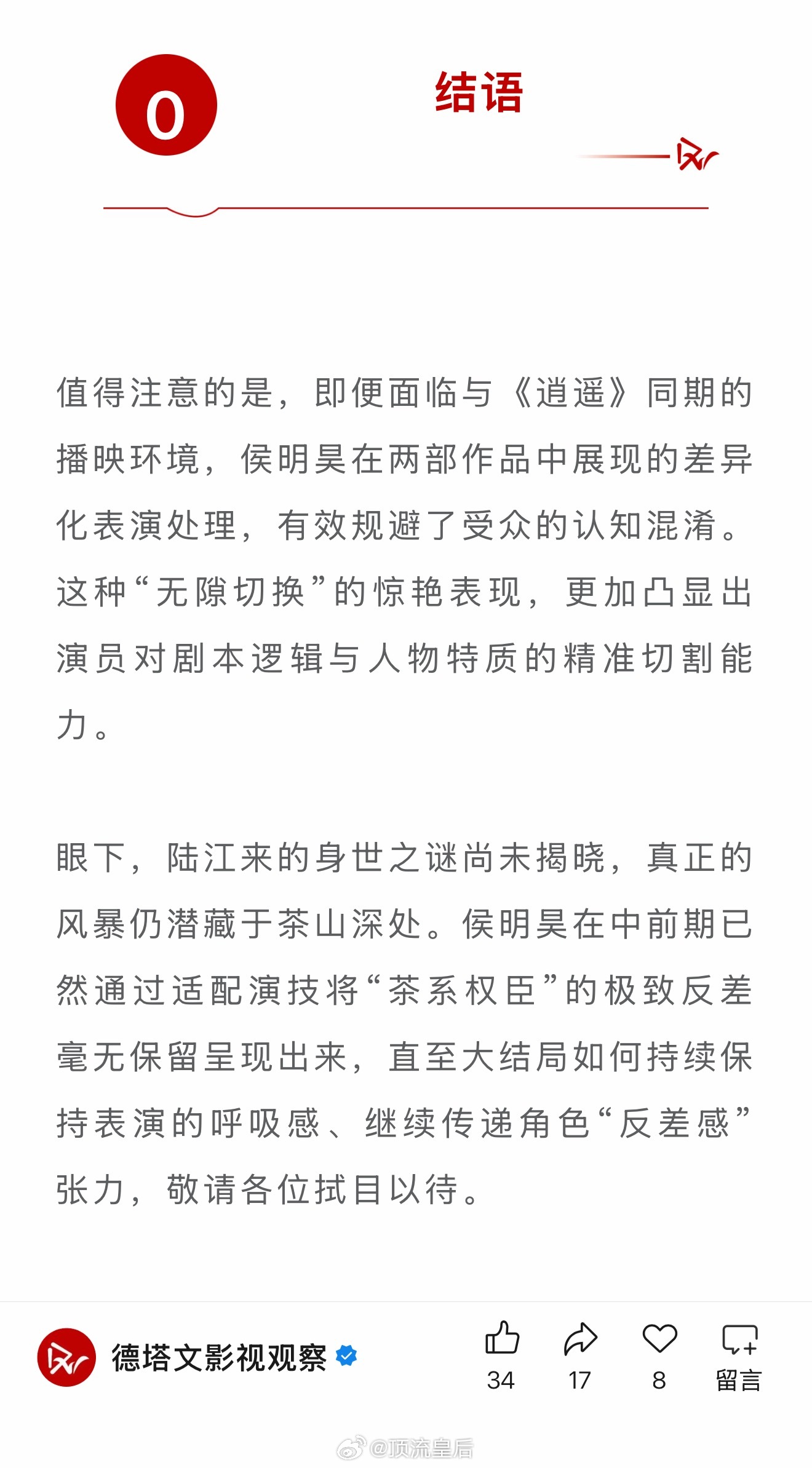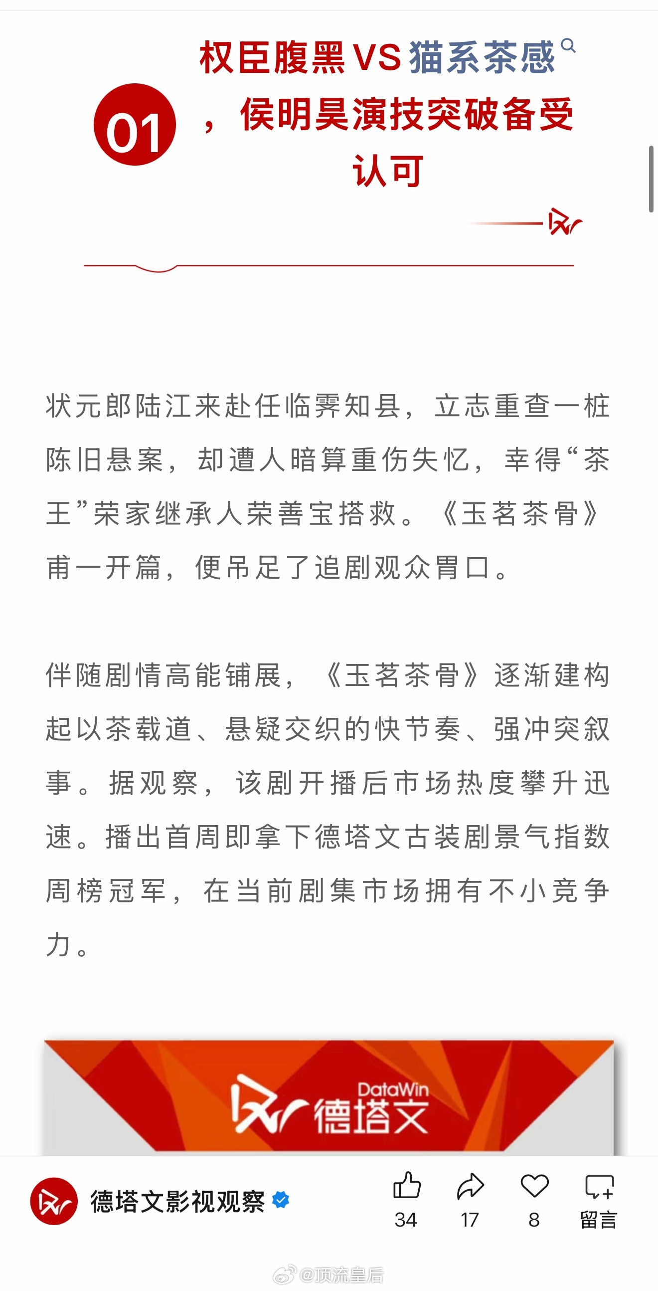 德塔文发文,侯明昊“茶系权臣”出圈,助力《玉茗茶骨》热度攀升权臣腹黑VS猫系茶感,侯明昊演技突破备受认可经验和阅历的“积累哲学”,成就“剧抛脸”式演技闭环