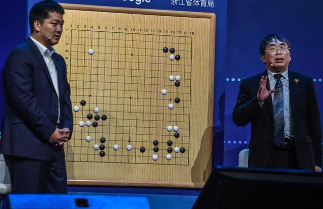 2017年,聂卫平和爱徒常昊一同讲解柯洁九段和“阿尔法围棋”的三番棋决战(新华社)