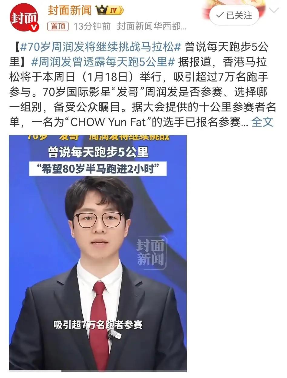 70岁周润发icon,被正式确认! 1月15日,周润发突然冲上热搜,原因是他传来一个让人担心又敬佩的惊人消息。原来本周日,香港icon马拉松赛道将迎来一位特殊跑者——70岁的周润发。 这位影坛巨星的名字,出现在了2026香港马拉松十公里组的选手名单里。就在1月18日,他将与超过七万名跑者一起,在熟悉的城市赛道上再次出发。 七十岁的人生,难道不该是含饴弄孙的年纪? 发哥偏不。他硬生生把老年活成了新的起点。去年半马跑出2小时24分33秒的成绩,已经让无数年轻人汗颜。今年他选择回归十公里赛道,每一步都在向世界证明:年龄从来不是梦想的终点。 看看他的跑步履历,简直是一部励志大片。2023年初次挑战十公里,他用1小时3分58秒完赛。第二年转战半马,成绩是2小时26分08秒。到了去年,这个数字提升到2小时24分33秒。越来越快的脚步背后,是日复一日的坚持——他每天雷打不动跑五公里。 这份坚持,比任何电影角色都更真实动人。褪去“赌神”、“小马哥”的光环,如今的发哥只是个穿着运动服、挥洒汗水的跑者。他曾笑着说,希望八十岁时半马能跑进两小时。这不是玩笑,而是一个七十岁老人写给未来的战书。 香港的街道记得他的身影。从演员到跑者,周润发完成了一次华丽的身份转变。当同龄人开始放慢脚步时,他却选择加速。马拉松赛道上的他,比任何红毯上的亮相都更加耀眼。 1月18日的香港,注定因他而不同。七万名跑者中,那个最年长的身影,或许正是最年轻的那个灵魂。他用脚步丈量这座城市,也用行动诠释着什么叫做“终身成长”。 各位读者你们怎么看?欢迎在评论区讨论。