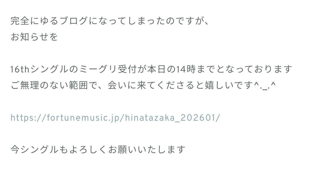 渡辺莉奈「2026初ブログ。今年もよろしくお願いいたします。正月気分はすでに抜けましたが、1月中旬という事に驚いております。はやいねー完全に寝正月で過ごしたので、引きこもりの血が騒いでおります。もう外に出たくないと叫んでる。暖かい室内に居たいじゃん。ただ家に居たいのもあるけど、引きこもりたい理由があるんですよ」