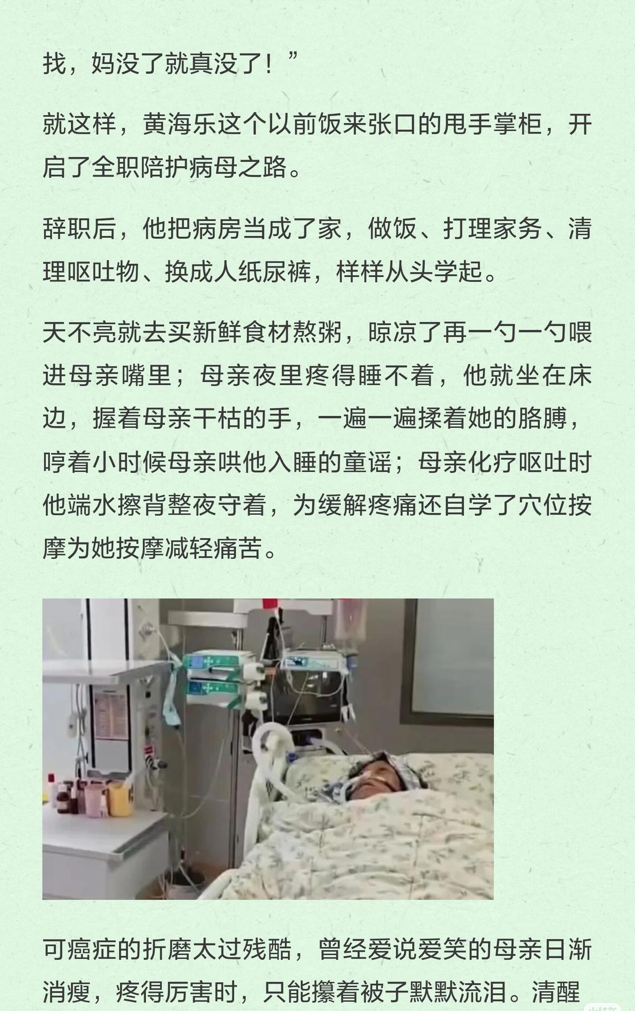 强留癌症晚期亲人并不是明智之举,文中说到的儿子,其实也不仅仅是儿子吧?他应该还有丈夫,父亲和女婿的身份吧?现实生活中,又有多少家庭能有条件做成他这样?辞职照顾以年为单位,没有房贷车贷?孩子读书?是应该歌颂他的孝顺,更应该赞扬他有一个好妻子,能够支持他做这样的决定。