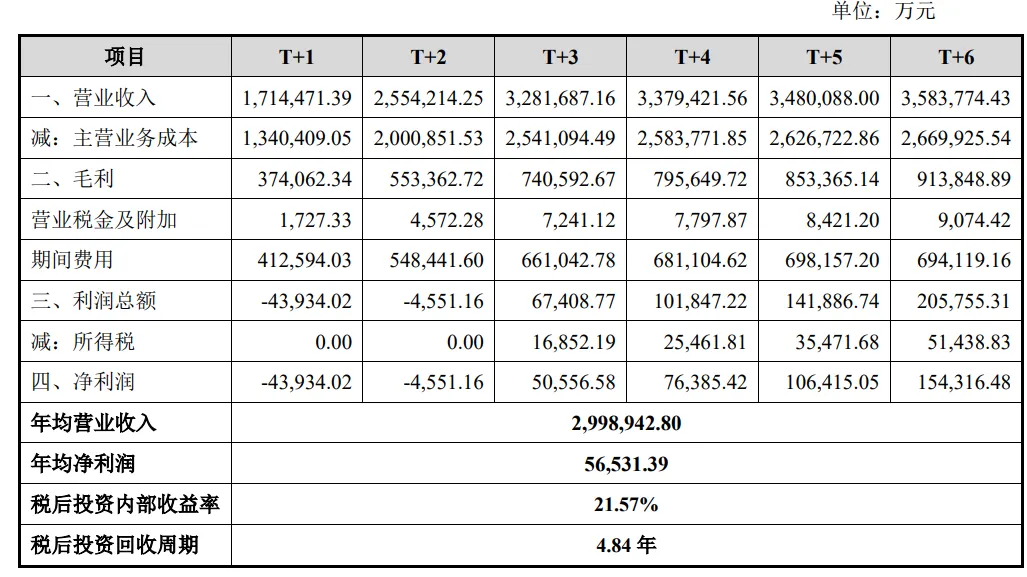 根据上述假设,本项目效益测算在T+1年为亏损,T+2年亏损大幅收窄,T+3年以后可以实现盈利,效益测算期间年平均净利润为56,531.39万元。