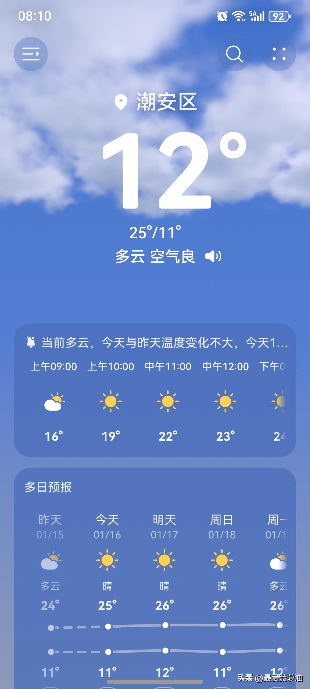 今年1号台风"洛鞍"已生成,本周后期广东温湿齐升,短袖返场,冷空气已预约下周到访,气温大幅下降,改穿羽绒服。 未来三日,广东大部晴间多云,气温总体趋于回升,部分市县有弱降水,早晚多雾。 今天(16日),潮州喜提一个多云天气,气温11~25℃,此刻气温12℃,体感温度10℃。 看看今天的天空!云量大增,不过云层薄弱的地方还是能看到一点点阳光。看那阳光透过云层的缝隙,倾洒而下的光束,洒在大地上,温暖着每一个角落,也温暖了人心。 除了有阳光的温暖,还有温暖的气温。今天的全天最高气温将上升到25℃,比昨天更加温暖了。这一天比一天暖和,暖和到让人怀疑:“这还是冬天吗?” 其他小伙伴不知道喜不喜欢这样的天气,反正我是很喜欢的! 今天的天气,凭实力获得一个五星好评! 如此天气!元芳,你怎么看? [捂脸][我想静静][笑哭][捂脸][我想静静][笑哭][我想静静][捂脸][我想静静]