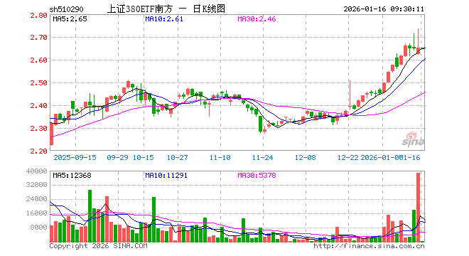 1月16日,上证380ETF南方(510290)开盘涨0.00%,报2.650元。上证380ETF南方(510290)重仓股方面,卧龙电驱开盘涨0.89%,赤峰黄金跌1.31%,瑞芯微涨1.30%,亨通光电涨1.53%,张江高科涨1.18%,华海清科涨1.94%,四川长虹跌5.05%,东吴证券涨0.44%,九号公司涨0.06%,晶晨股份涨1.02%。