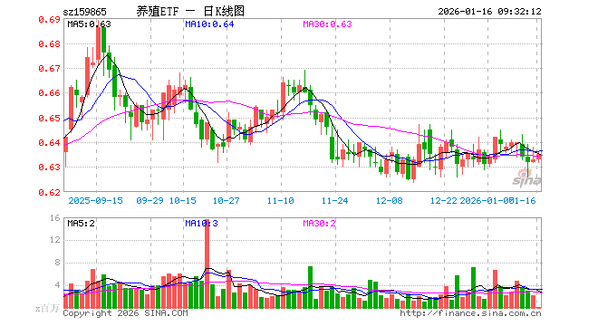 1月16日,养殖ETF(159865)开盘涨0.00%,报0.633元。养殖ETF(159865)重仓股方面,牧原股份开盘涨0.02%,温氏股份跌0.18%,海大集团涨0.21%,新希望涨0.22%,梅花生物跌0.76%,大北农涨0.00%,圣农发展涨0.00%,生物股份涨0.47%,天康生物跌0.14%,立华股份跌0.10%。