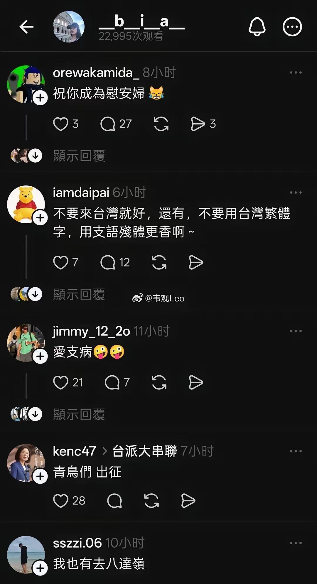 青鸟与蛙蛙,这就是他们在外网丑陋的面目。 当随着来华旅游的外网博主写下旅游感受“中国,我非常爱你!”时,结果却招来了一群青鸟和蛙蛙,它们把最丑陋的一面展露了出来,集体到这位博主贴文下面留言,污言秽语甚至是带着歧视的语言,让人不忍直视。 而简体、繁体中文字,对于外网的人来说都是汉字,他们根本分不清。青鸟与蛙蛙这样四处对这些对华有好感的博主喷FEN,不仅让人气愤,更是可能让外网的网民误以为被中国人攻击了! 这群蝇营狗苟简直就像网络里的苍蝇,四处嗡嗡嗡个不停,到处恶心人,但似乎又没有什么更好的办法对付它们。 大家讨论下,面对青鸟和蛙蛙这样的行径,该怎么破呢?