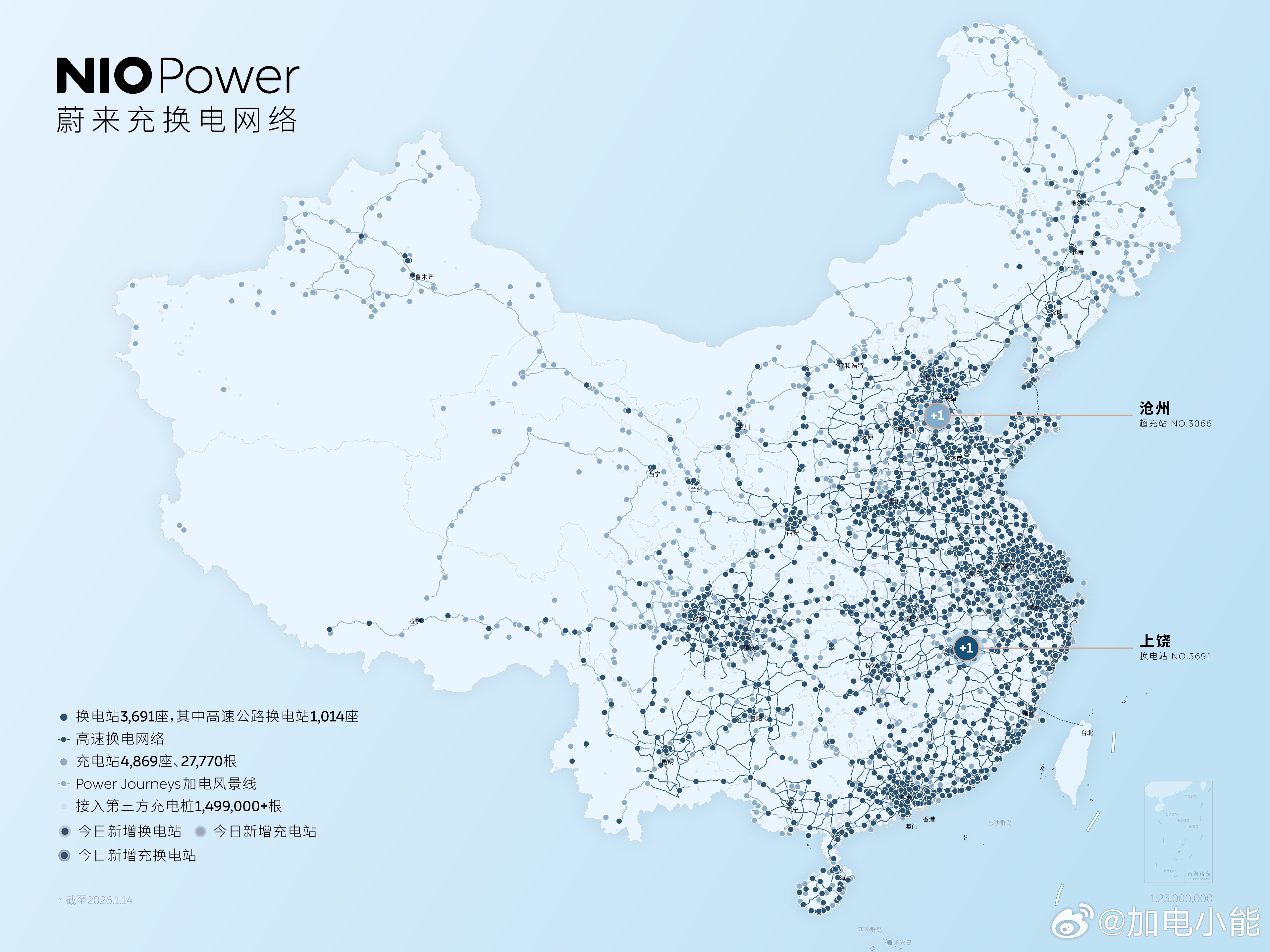 1月14日 NIO Power 2站上线NO.3691 蔚来换电站 | G35济广高速万年西服务区广州方向NO.3066 蔚来超充站 | 沧州市运河区天成明月洲二期持续布局-让加电比加油更方便