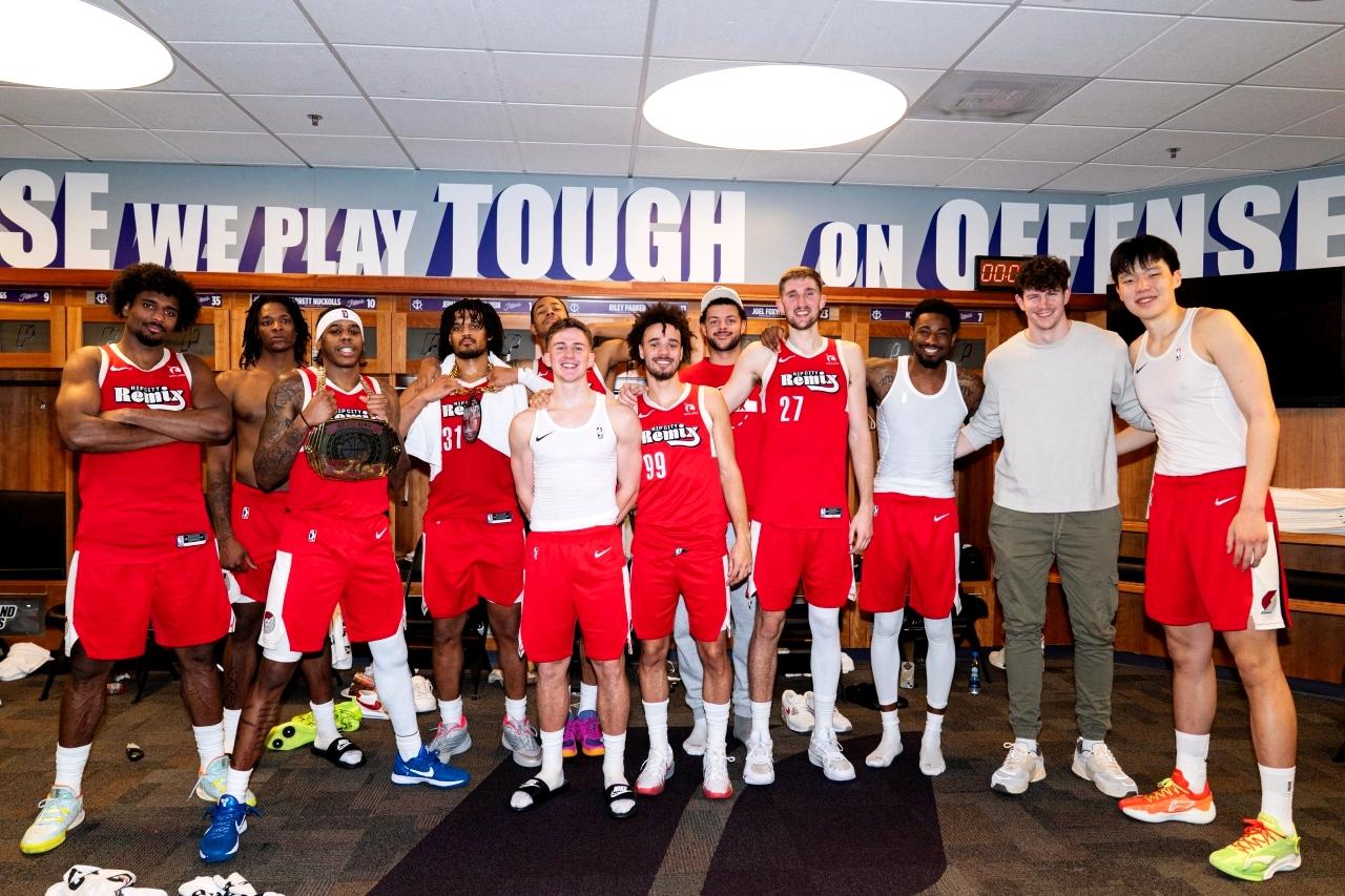 混音队球员合照,就问你杨瀚森的胸肌亮不亮? 开拓者下属球队混音队,比赛后发出了