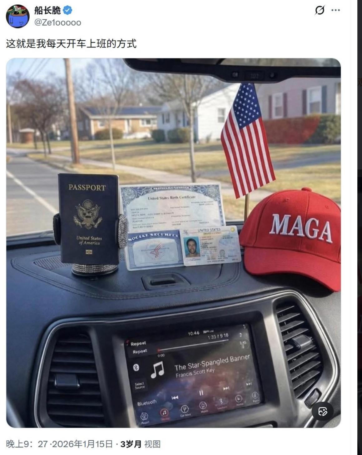 风能进,雨能进,国王不能进。 但是,ICE可以进。而且是,可以肆无忌惮的想进就进。 图四,是美国网友发的,现在每天上班时,车上一定要齐备的物品。那顶MAGA的帽子是亮点,可惜摆错了方向,应该帽沿朝外让ICE能够第一时间看到,而不是朝里自我安慰。