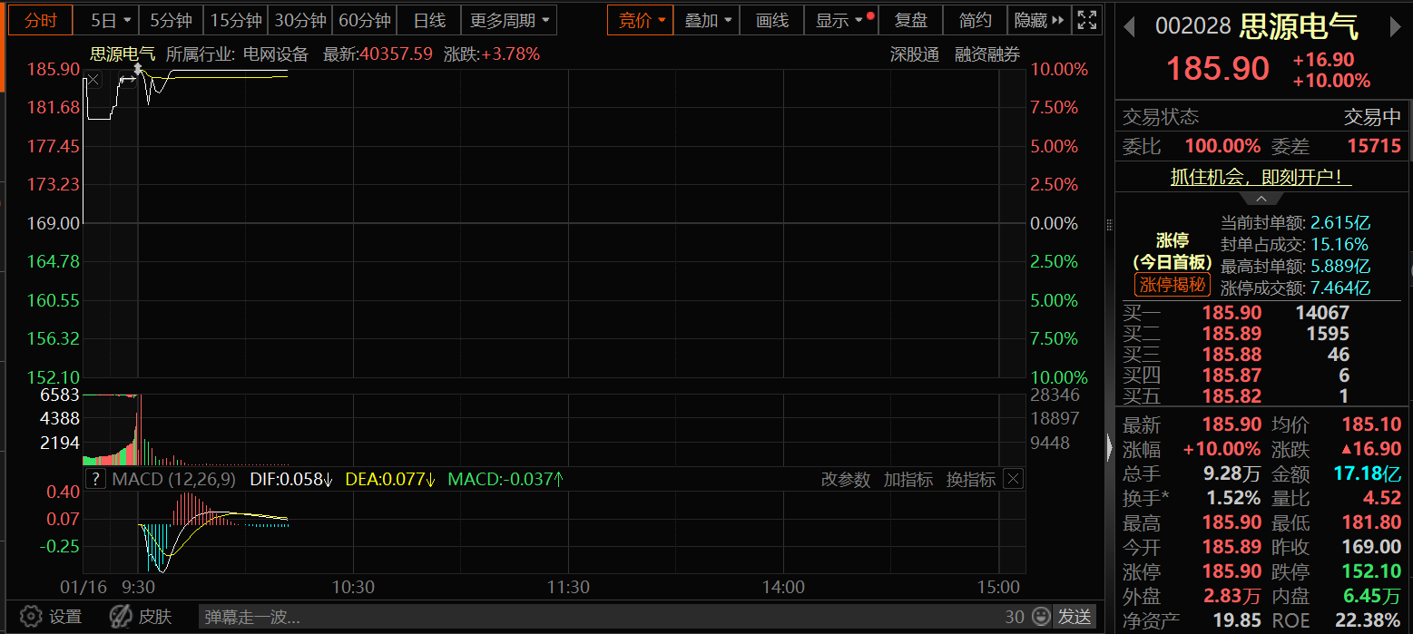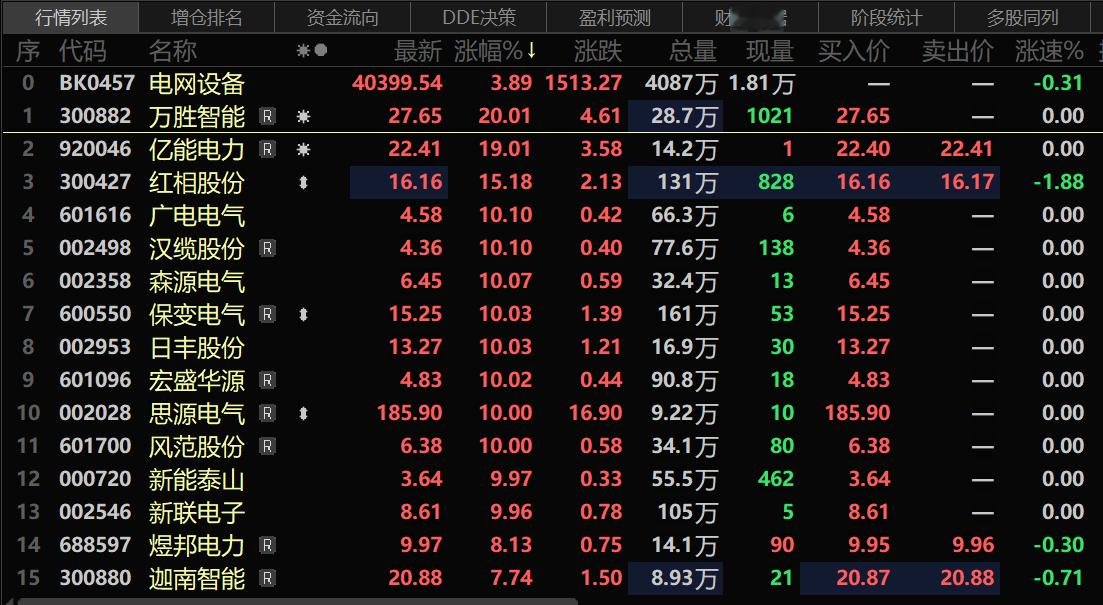 上证报中国证券网讯(邱思雨记者操子怡)1月16日早盘,电网设备概念股全线走高,截至10时07分,思源电气、保变电气、森源电气等多股涨停,万胜智能20CM涨停。