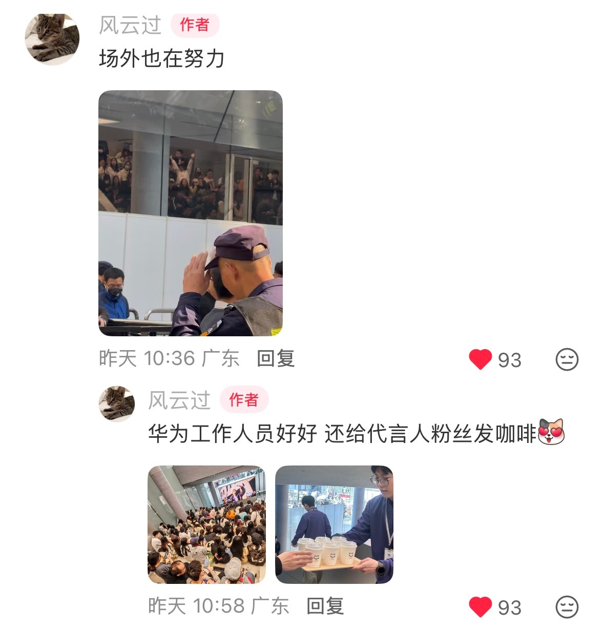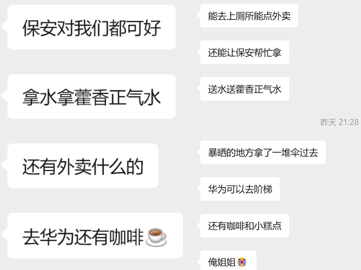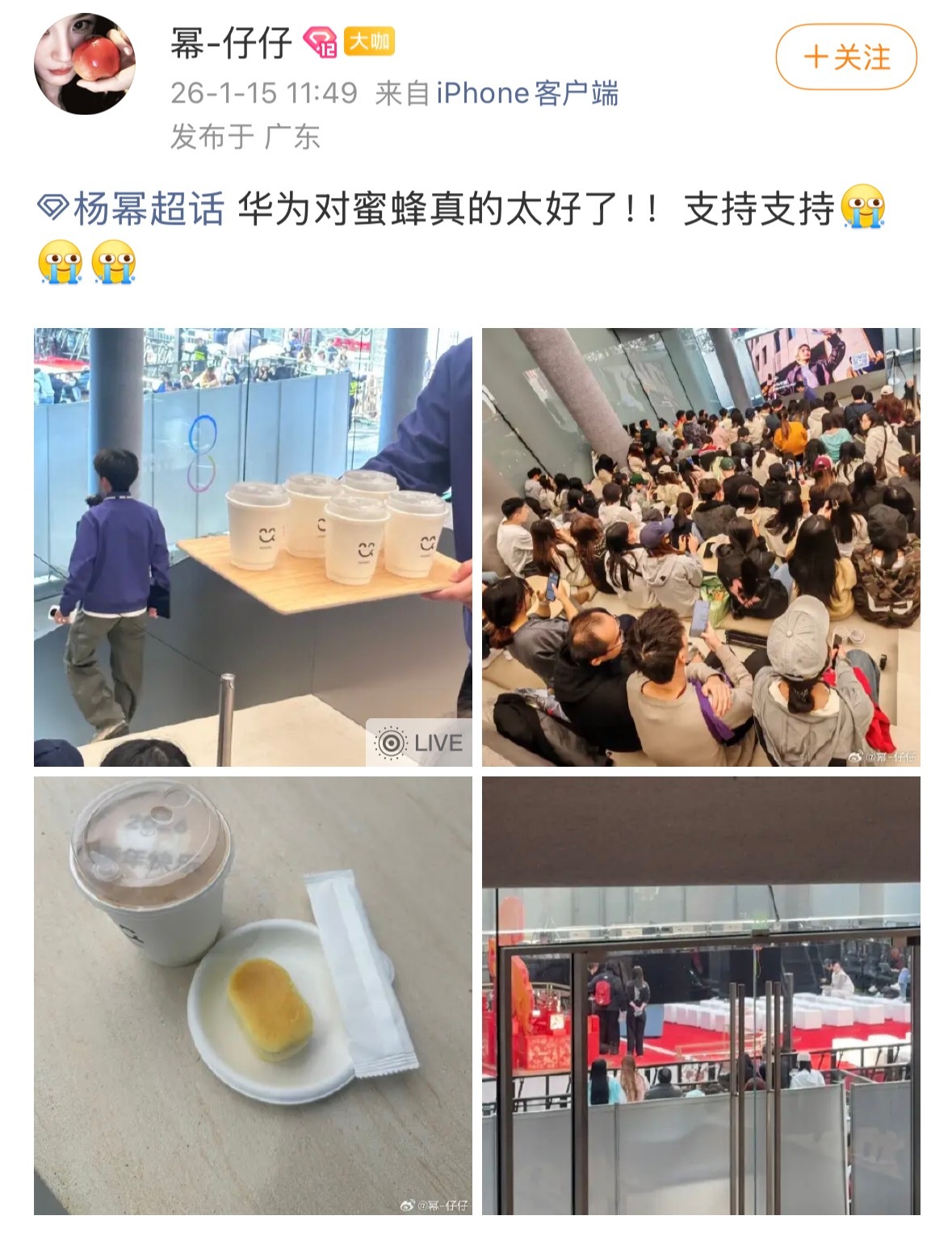 杨幂 上班真的错过好多后知后觉我才看到昨天去活动现场的小蜜蜂说安保大哥送水送伞送藿香正气水还有999,保安帮忙拿外卖。而且后面好多蜜蜂去了华为店里希望可以外场看幂,工作人员还送咖啡和小糕点。这一看就是姐重视粉丝心疼蜜蜂,然后交待品牌方去做的。俺姐一直宠蜜蜂,把蜜蜂放在心里