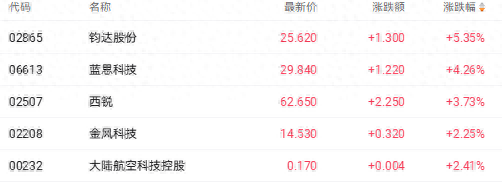 财联社1月16日讯(编辑胡家荣)今日港股市场航天概念股表现活跃,截至发稿,钧达股份(02865.HK)涨5.35%、蓝思科技(06613.HK)涨4.26%、金风科技(02208.HK)涨2.25%、大陆航空科技(00232.HK)涨2.41%。