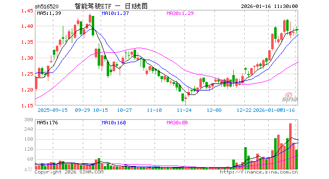 1月16日,截止午间收盘,智能驾驶ETF(516520)涨0.36%,报1.385元,成交额1.62亿元。智能驾驶ETF(516520)重仓股方面,立讯精密截止午盘涨2.09%,芯原股份跌4.34%,拓普集团涨3.98%,豪威集团涨1.23%,科大讯飞涨0.49%,德赛西威涨1.19%,闻泰科技涨1.03%,欧菲光跌1.26%,均胜电子涨3.69%,思特威涨2.44%。