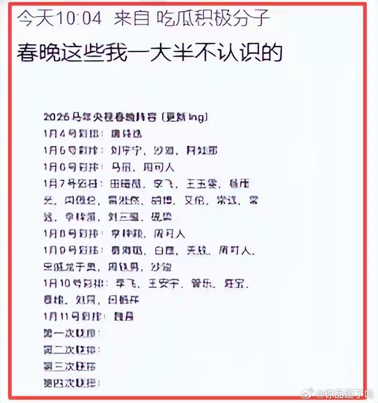 稳了!2026春晚彩排阵容曝光,岳云鹏退出,大咖回归,新人挑大梁。蔡明回归65岁老将“杀”回春晚,网友泪崩,14位大咖现身,新人老将齐上阵虽然岳云鹏没来,但其他人来了,来的还不少。从最早现身的唐诗逸,到后来的马丽、沙溢、秦海璐、辛柏青……从专业舞者到老戏骨,从综艺咖到小品演员,这份名单看起来,终于有点“春晚味儿”了。