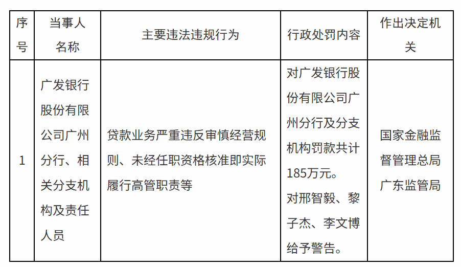 这是广发银行进入2026年后收到的第二张罚单,处罚力度随主体层级明显升级,1月5日的罚单针对广发银行新会支行,该行因“违反审慎经营规则”被处以31万元罚款,相关责任人陈铁锋、谭振锚同步被给予警告处分;1月6日的处罚对象升级至广州分行,其因两项核心违规事实领受185万元罚单:一是贷款业务严重违反审慎经营规则,二是部分高管在未获任职资格核准的情况下,便实际履行了高管职责。