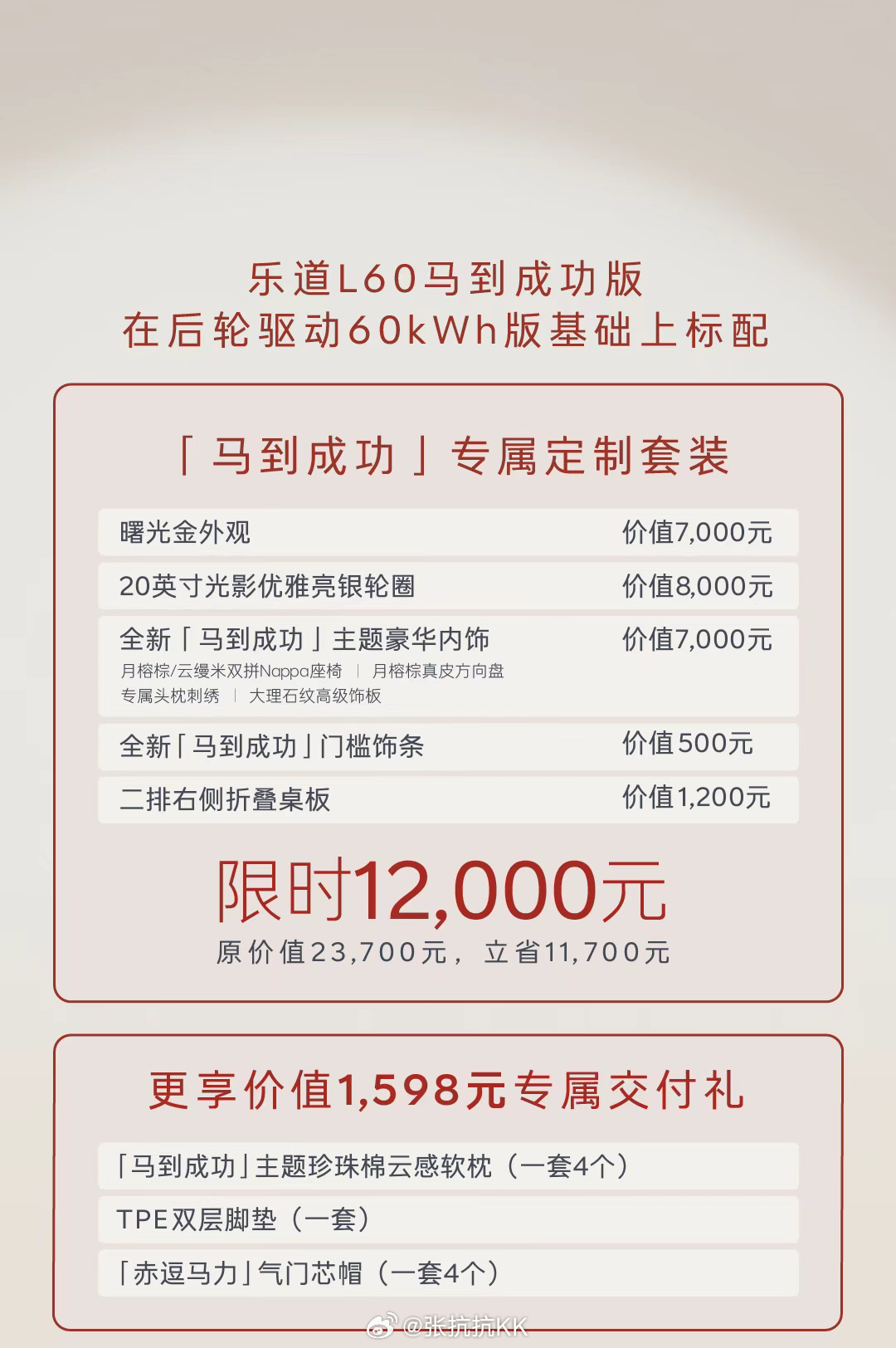 乐道L60的「马到成功」版上市,整车购买21.89万元,电池租用方式购买16.19万元。与老版本的区别是采用了乐道马年专属标识和Nappa双拼内饰。 蔚来