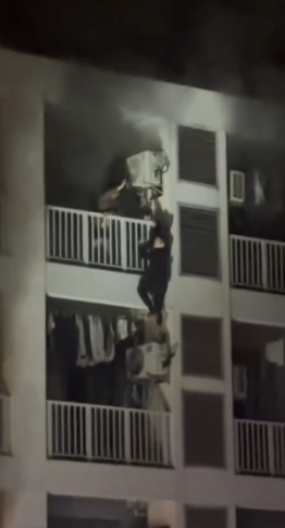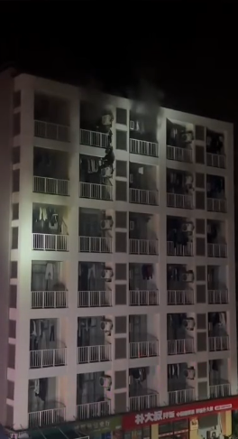 网友提供的视频显示:有浓烟从该栋宿舍的六楼冒出,其中有一名穿黑色衣服的男子试图从阳台护栏翻出,爬至下一层阳台。