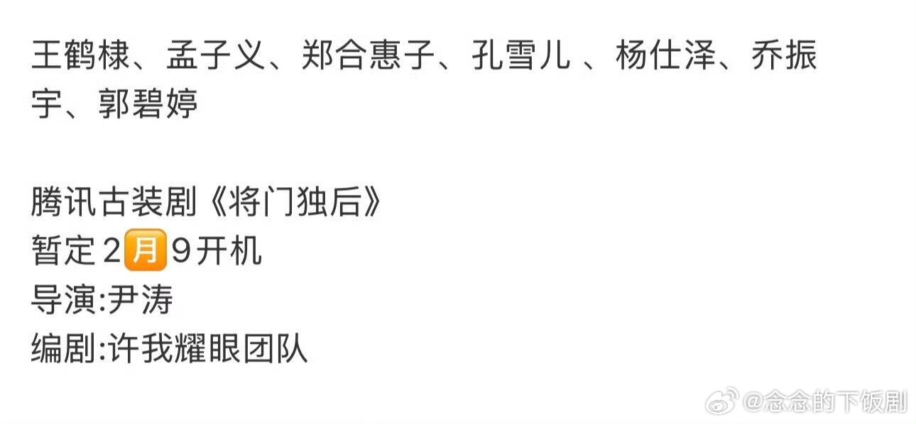 网传将门毒后即将开机网传将门毒后即将开机主角王鹤棣跟孟子义无变动编剧是许我耀眼的团队你期待吗将门毒后‖