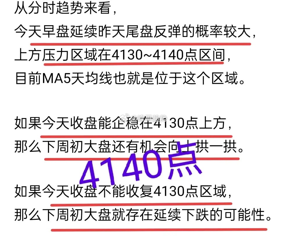 A股:峰哥讲过,压力区域在4130~4140点,做两手准备!早盘延续了昨天尾盘的反弹,涨到最高点4140点(算精准吧)!昨晚的再贷款利率下调消息,让不少投资者对今天的行情抱有良好憧憬。昨天收评的时候,峰哥就讲过,由于分时MACD死叉,大盘要企稳在4130点上方,短线才能松一口气。今天早盘大盘顺势反弹,最高点4140点。刚好到了峰哥盘前预测的阻力区域上限(4130~4140点)。商业航天板块的高标股,风险继续释放,跌停板个股不少。因为昨天的成交量缩得太快了,成交量有继续释放的要求。所以,板块个股继续下跌也就在情理之中了牛市已经进入了下半场,选股胜于盯大盘。两手准备的意思,该走的要走,能留的就留。中低位的AI方向的个股,可以逢低吸纳。因为有些个股成交量集中放大,但涨幅有限,其中的资金无法在短期内撤离,存在反弹机会。当然,仅限于中低位的标的,高标股东风险向商业航天看齐!第二板了,舒服吧个人观点,仅供交流,不构成投资建议!理财有风险,投资需谨慎!A股指数大盘要跌吗今日看盘金价彻底杀疯了