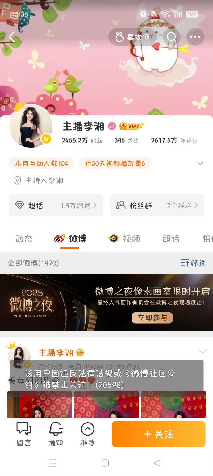 1月16日,李湘社交媒体账号:抖音、微博、小红书等平台突然都被禁止关注,具体情况不清楚。 有人觉得她是炫富的原因,也有人觉得是她与周也事件的延伸,更有人说是跟之前彭十六的事情一样,大家众说纷纭,但无论怎样,突然所有平台都做出同一动作就证明肯定有事发生,就让子弹再飞一会看后续情况吧!