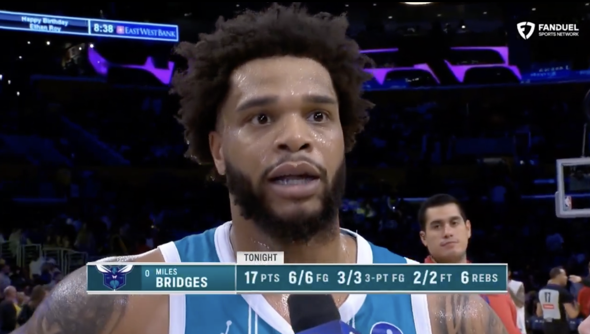 半场结束时黄蜂64-55领先湖人,迈尔斯-布里奇斯接受了记者采访,谈到了拉梅洛-鲍尔送出7次助攻。
