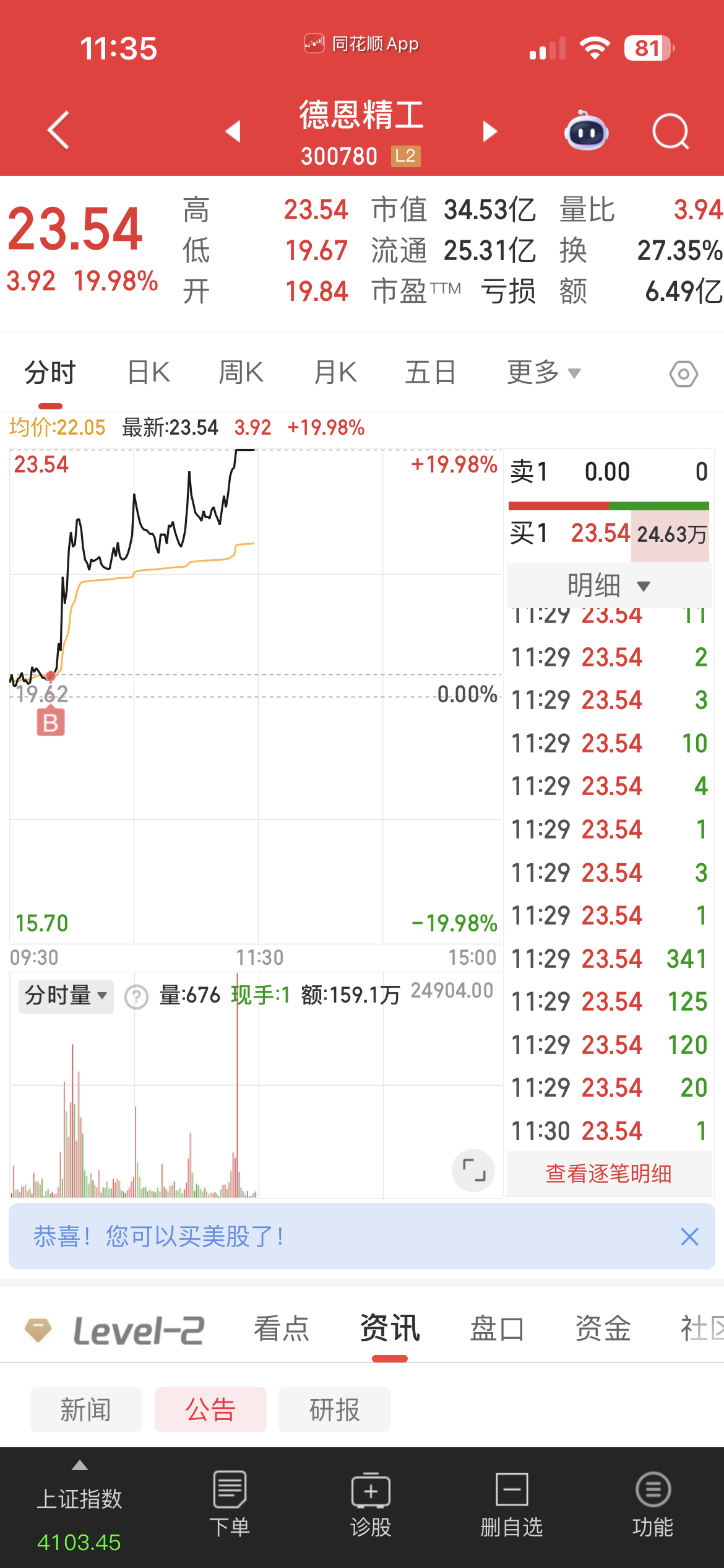 漂亮:$德恩精工 sz300780$ 强势涨停,