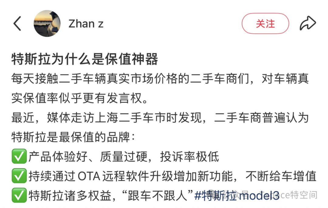 12月中国乘用车保值率报告出炉!Model 3连续三个月都是最保值纯电车,Model Y位列第二近日,中国汽车流通协会与精真估联合发布《2025年12月中国汽车保值率研究报告》,其中,特斯拉Model 3与Model Y超越多款热门车型,在纯电动车型保值率(三年车龄)榜单中包揽前两名。值得一提的是,在此前公布的2025年10月和11月中国汽车保值率研究报告中,Model 3同样位居纯电动车保值率(三年车龄)榜首,截至目前已连续三个月稳居最保值的纯电动车。特斯拉的高保值表现已在多项权威研究中得到验证。在CCPIT-AUTO(中国国际贸易促进委员会汽车行业分会)与蓝本价联合发布的《2025年第三季度中国汽车保值率排行榜》中,Model 3与Model Y分别成为最保值的国产纯电中型轿车和纯电中型SUV。网友表示,每天接触二手车辆真实市场价格的二手车商们,对车辆真实保值率更有发言权。媒体近日走访上海二手车市场时发现,二手车商普遍认为特斯拉是最保值的品牌,并总结出三大核心因素:1、产品体验好、质量过硬,投诉率极低;2、通过持续的OTA远程软件升级增加新功能,不断给车辆增值,让消费者“不花钱”就能月月开新车;3、车型销量可观,庞大的市场保有量赋予了特斯拉在二手车市场强劲的流通性与持续的需求。即便是5年、10年前购买的特斯拉,也能通过特斯拉OTA远程软件升级,实现持续进化。车主可以不断免费获得新的功能,“不花钱”就能开新车。海外博主BLKMDL3 的2019款Model 3使用至今已近7年,依然能够获得免费的软件更新并解锁多项新功能。“这些升级让车辆更安全、更好用”,这种持续进化的能力,不仅显著延缓了车辆的价值折损,也延续了用户的长期满意度。正如马斯克所言:“今天买车就是对明天的投资,买特斯拉就相当于买了一项会持续增值的资产,而不是会不断贬值的负担。”特斯拉马斯克欢乐购车季