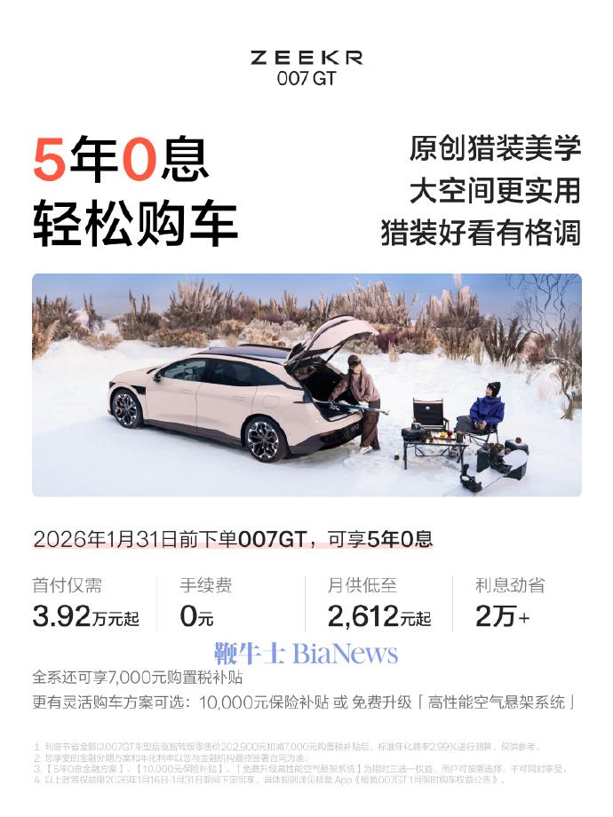 极氪007GT定位猎装轿跑,2026年1月登陆欧洲市场,国内提供后驱单电机(310kW)与双电机四驱(475kW/710N·m)版本,车身尺寸4864×1900×1445mm,轴距2925mm。核心技术包括800V碳化硅平台,搭载双Orin-X芯片(508TOPS算力)与千里浩瀚智驾H7方案,全系标配激光雷达,支持无图城市NZP与全场景智能泊车功能。(转载自:电车界)
