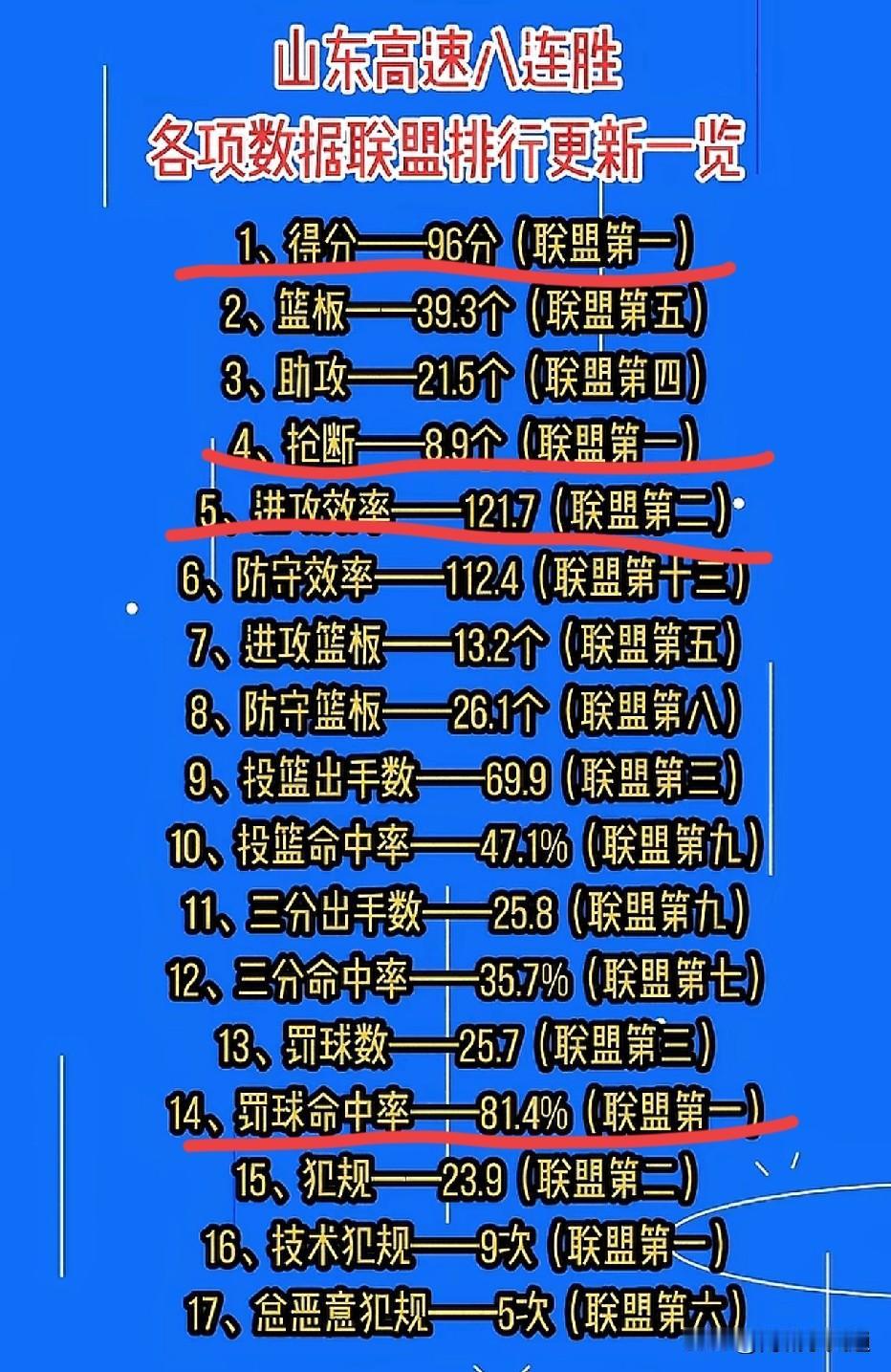 山东高速男篮八连胜了,今天咱们来看看山东高速男篮的各项数据统计吧。 场均得分96分,高居榜首。 抢断8.9次,联盟第一。 进攻效率121.7,联盟第二。 罚球命中率81.4%,联盟第一。 看看这几个数据,比起上个赛季确实有了进步。成绩也慢慢好了起来了。外援和国内球员的配合也越来越成熟了。 短板渐渐在补强。 除了犯规和技术犯规需要注意外,其他的都渐渐步入正轨了。 大家说,山东高速男篮那个位置还需要补强? 这波八连胜会不会继续下去?能不能10连胜?