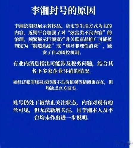 李湘多个平台账号被禁,释放一个什么信号? 李湘多平台账号被贴上“禁止关注”的标签,这绝非偶然的平台单独操作,而是监管层向整个网络生态释放的一次清晰且强硬的信号——网络名人的流量光环,再也罩不住违背公序良俗与监管规则的行为,互联网“炫富拜金”的歪风,正迎来最严格的整治时刻。 从监管背景来看,此前《关于规范网络名人账号行为管理的通知》早已将“宣扬炫富拜金”列入网络名人行为负面清单,这并非一纸空文,李湘长期在社交平台晒出的“月伙食费60万”“万元名包与限量鞋”等奢华生活内容,正是对这一规则的直接触碰。 这意味着监管层对网络内容的价值导向治理,已经从口号落实到具体的账号处置,不再容忍头部网红用极致的物质展示传递不良社会风气,哪怕是曾经的知名主持人,也没有违规的“特权”。 而多平台同步采取限制措施的举动,更凸显出跨平台联合惩戒机制的成熟。 过去,部分网红在一个平台违规后还能转战其他平台继续运营,如今这种“钻空子”的路径被彻底堵死,平台间形成了违规信息的共享与处置联动,让网络名人的违规成本成倍增加。 这背后是行业对“流量至上”逻辑的纠偏,平台不再为了短期的流量收益,放任头部账号挑战社会公序良俗与监管底线。 同时,此次事件也不只是针对“炫富”这一个单一行为的整治,更是对网络名人全维度商业行为合规性的敲打。 李湘涉足的直播带货、商业代言等领域,此前就曾曝出虚假宣传、企业经营合规性存疑等问题,监管层的处置,实则是明确了网络名人的流量变现必须踩在法律与规则的红线内,无论是内容创作还是商业操作,都要接受更严苛的审视。 说到底,李湘账号被禁的案例,撕开了互联网行业曾经“唯流量论”的遮羞布。 未来,网络名人的核心竞争力将不再只是吸粉能力,而是能否守住价值观底线、做到商业行为合规。这场整治,最终指向的是让互联网回归传递正向价值、服务社会大众的本质,而非成为少数人炫富攀比、收割流量的工具。 娱乐圈 明星