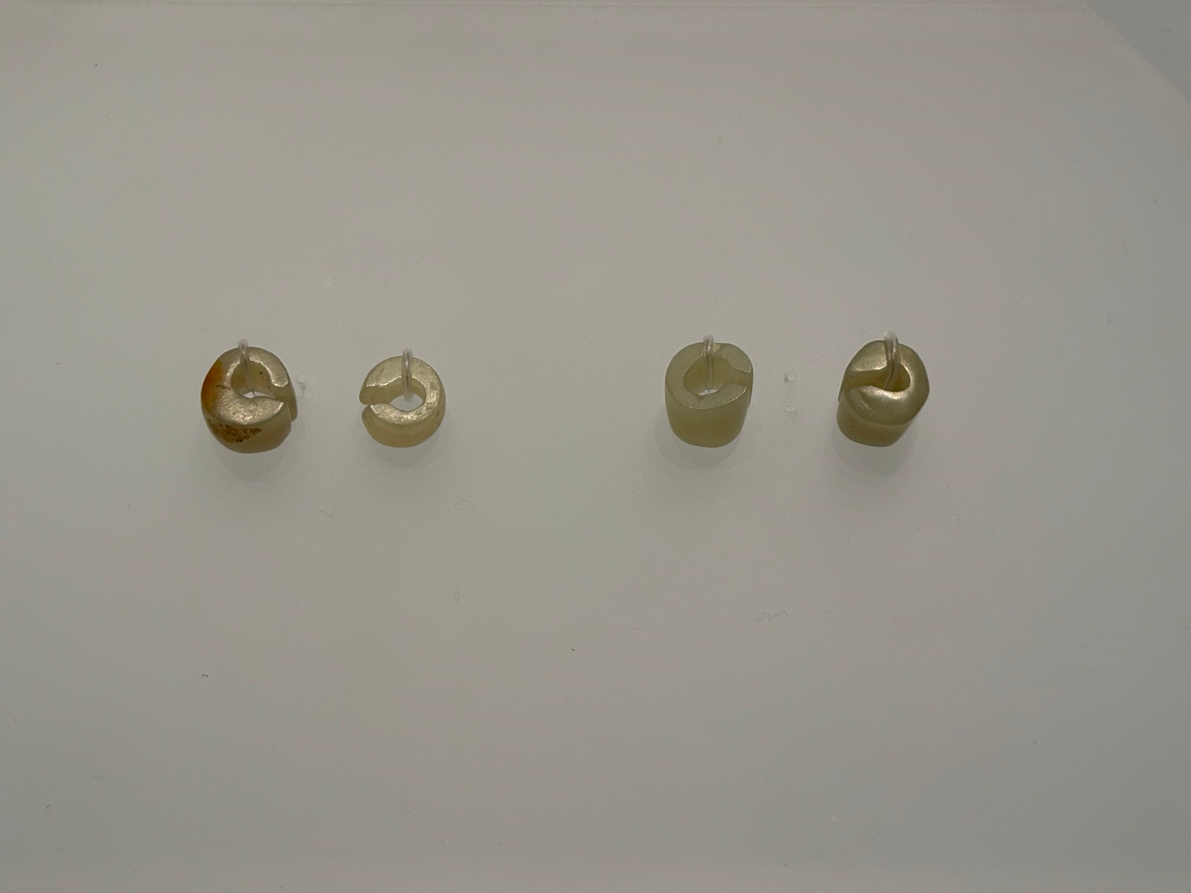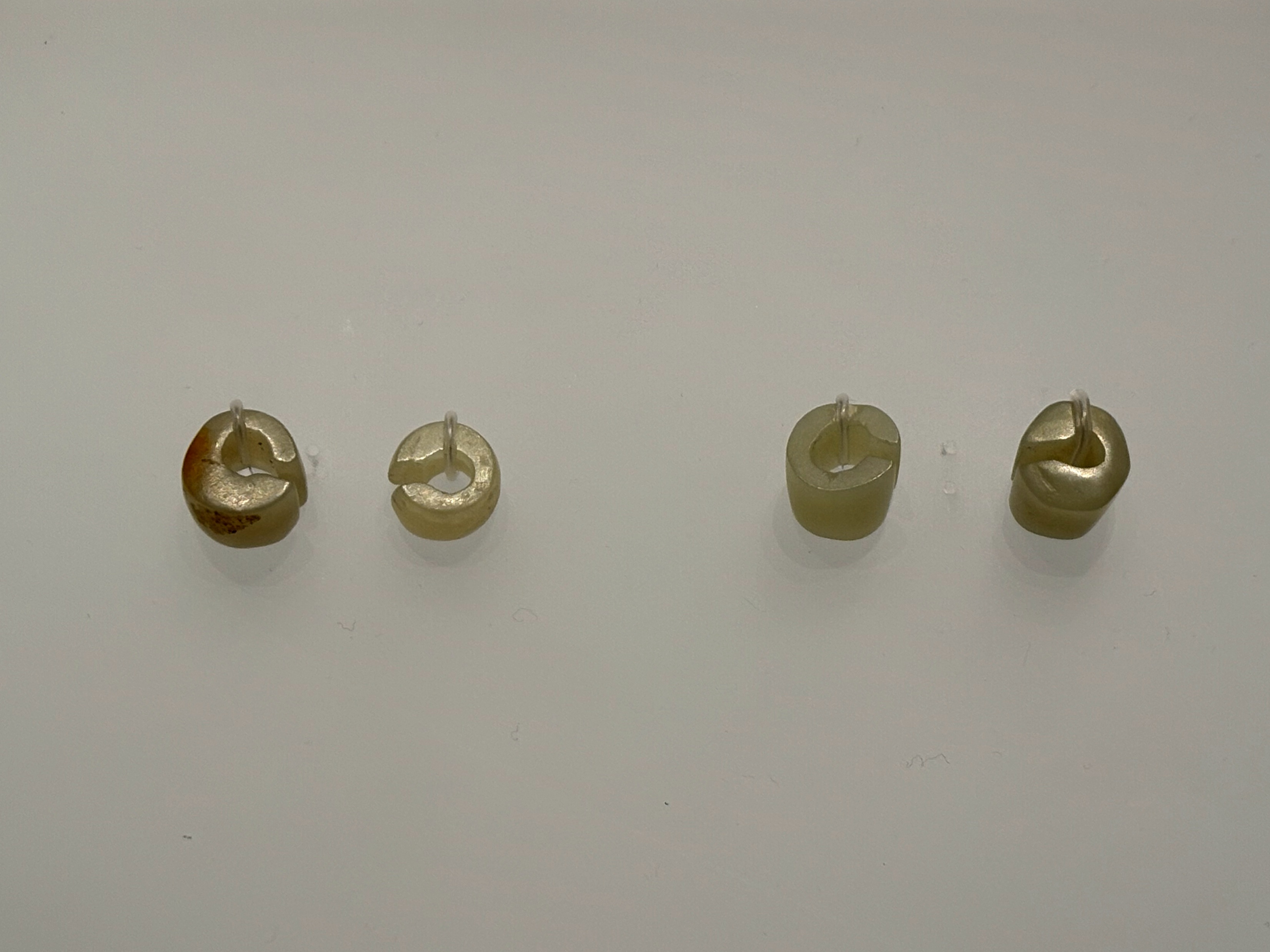 中国考古博物馆藏内蒙古敖汉兴隆沟遗址第一地点出土的兴隆洼文化(公元前6200-5200年)玉玦。出土时位于墓主人左右耳部,应该是耳环。7000~8000年前已经可以磨制如此精细的玉器了