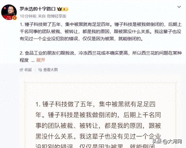 罗永浩称锤子科技做了5年被黑4年,倒闭是自己的原因,没见过企业被黑就倒闭;自曝对西贝“两次主动收手”