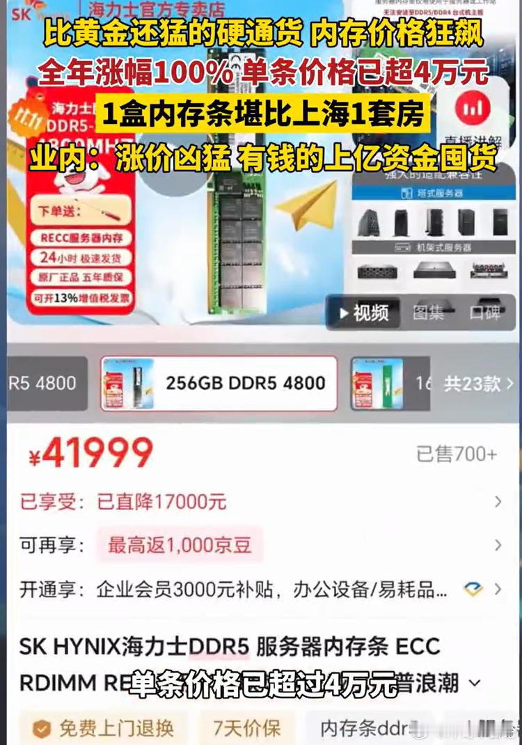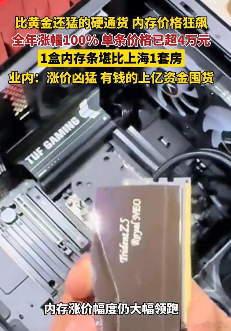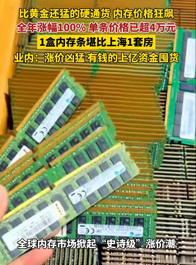 当一根256GB的DDR5服务器内存条价格突破4万元,整盒100根总价高达400万元——相当于上海远郊一套小户型房产时,“内存条价格杀疯了”已从网络热梗变成终端消费者、企业采购商和整个电子产业必须直面的现实风暴。DDR4内存条年内涨幅超150%,16GB型号从2025年初约300元涨至2026年1月的1100元(济南市场),深圳华强北同规格产品高达1600元。DDR5涨价更剧,32GB套装半月涨幅达42%(2379元→3372元),部分高端服务器内存(256GB DDR5)单条突破4万元。河南市场商户反馈内存条“一天涨50-60元”,10天内某型号从4800元跳涨至5300元。华强北等市场因价格波动剧烈改用“口头报价”,二手平台涌现“拆机条理财”,拆售旧内存条可获利200-400元。单台AI服务器内存需求是普通服务器的8-10倍,消耗全球53% 的DRAM月产能,OpenAI等企业独占40%以上高端产能。整机成本激增500-1500元,联想、惠普中高端机型涨价5%-30%,荣耀笔记本月内提价400元。手机/智能设备:512GB版本存储成本增加500元,红米K90顶配机型涨价700元,部分厂商取消1TB版本。内存条价格杀疯了内存条涨得比金条还快一个256g内存条价格已超4万元
