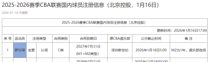 虎扑01月16日讯今日,CBA官网更新国内球员注册信息。