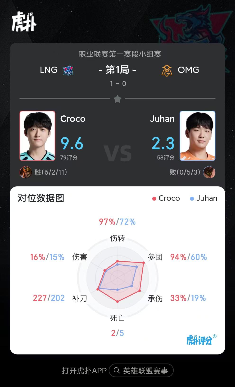 虎扑01月16日讯在刚刚结束的LNG对阵OMG首局比赛中,Croco皇子打出6/2/11战绩,拿到首局比赛MVP