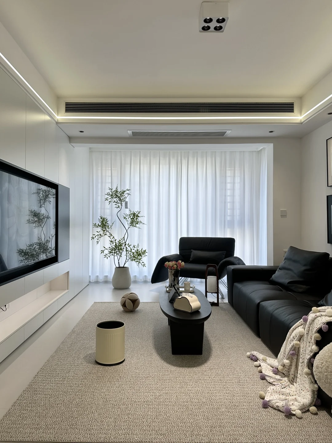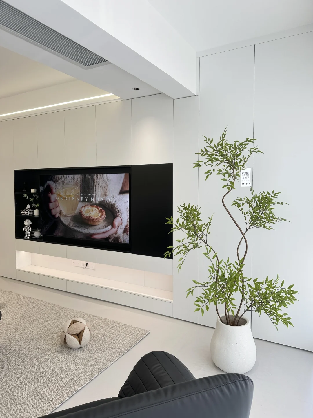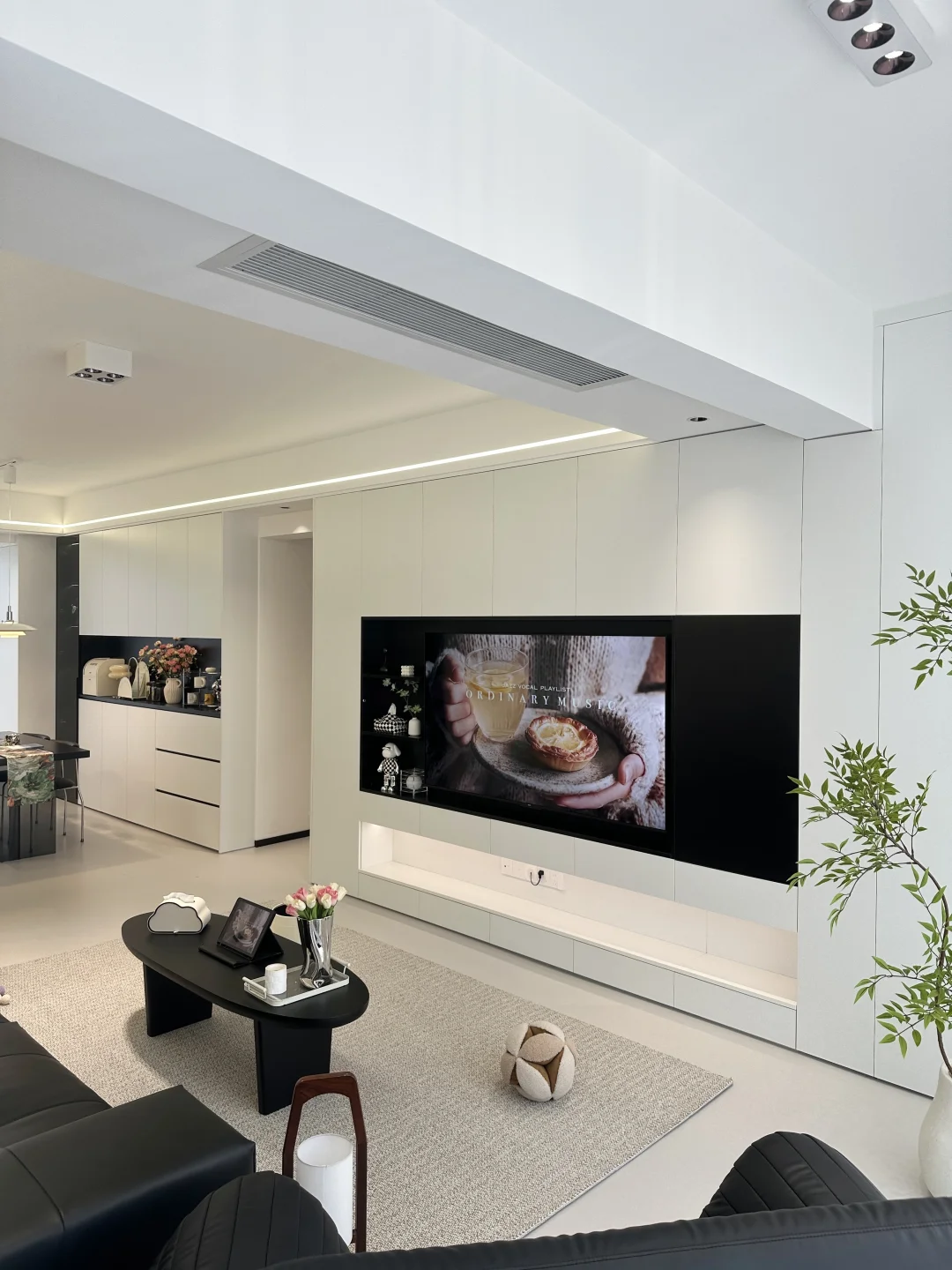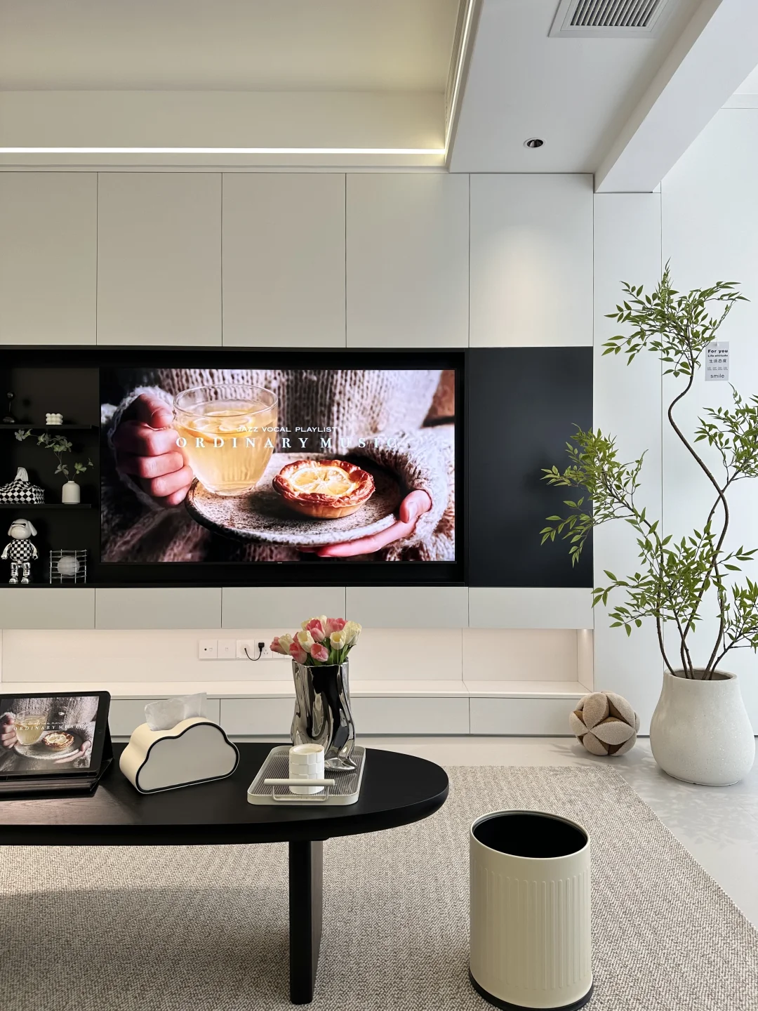 120平毛坯房自装,硬装花了16w,落地23w 简约的黑白灰风格,全屋通铺柔光砖 客餐厅一体,满墙的电视柜➕餐边柜 黑白配色真的很酷,看着就干净利落 这大概就是软装的魅力,仿真绿植点缀氛围感拉满 往后每日的三餐四季,既陌生又期待[派对R]