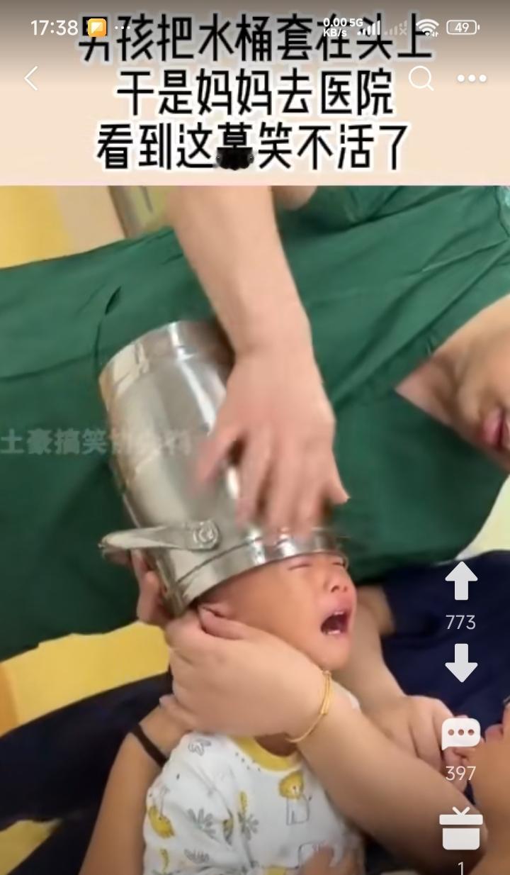 熊孩子把水桶套在头上了,取不出来,孩子妈忙带孩子到医院看外科。 网友说,孩子熊,