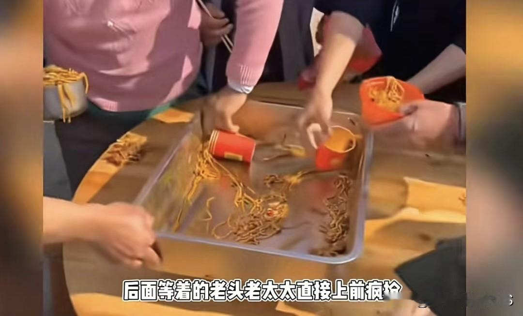 江西丰城的龙哥本来想借着网红呆呆的热度,办一场杀猪饭宣传家乡,结果却被村里的大爷大妈们来了个抢饭大战。 龙哥请了100桌,本想让网友们好好尝尝家乡味,结果附近的大爷大妈们先得到了消息,直接把餐桌围了个水泄不通。菜还没上桌呢,大妈们就端着盆、拿着碗往前冲,前面一桌还没上完,后面的就直接上手抢了,有的抢不到甚至把桌子都掀了,主打我抢不到你们也不别抢。更绝的是,还有大妈不仅白吃临走时连碗都打包带走,堪称“打包第一人”。抢不到桌前的,就直接守在锅边,围着锅铲等饭吃,做饭的阿姨都得先保证锅还在。 来捧场的网友们只能干坐在桌前看,最后大爷大妈们拿着满满当当的“战利品”回家了,只留下满地狼藉和饿着肚子的网友们。