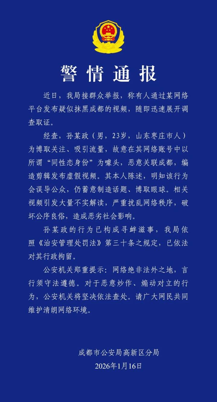 经查,孙某政(男,23岁,山东枣庄市人)为博取关注、吸引流量,故意在其网络账号中以所谓"同性恋身份"为噱头,恶意关联成都,编造剪辑发布虚假视频。其本人陈述,明知该行为会误导公众,仍蓄意制造话题、博取眼球。相关视频引发大量不实解读,严重扰乱网络秩序,破坏公序良俗,造成恶劣社会影响。